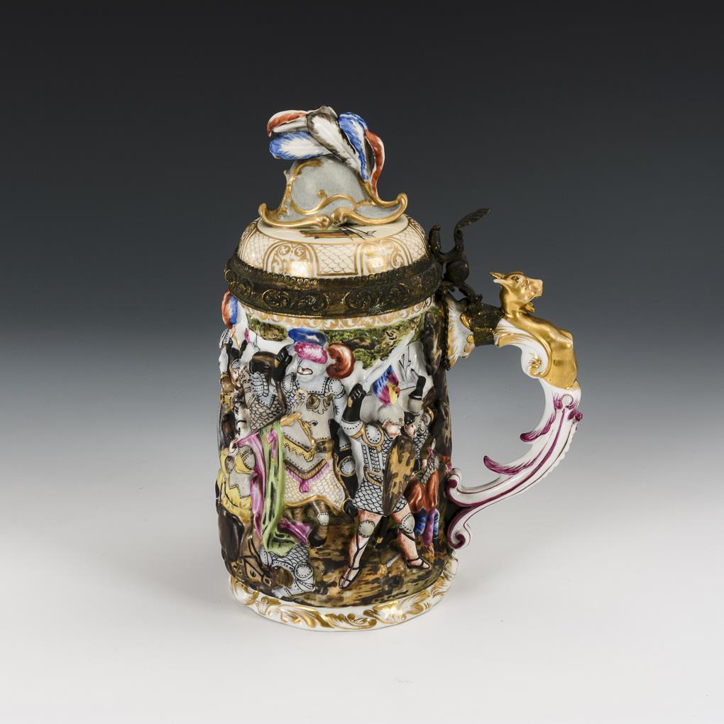 Zylindrischer Krug mit umlaufendem Schlachtenrelief sowie Helmknauf auf dem metallmontierten Deckel. Minimaler Goldabrieb.