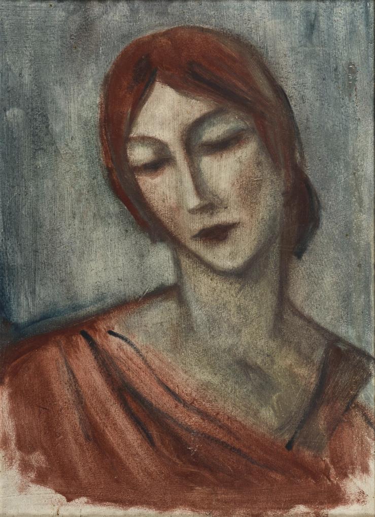 Bildnis einer jungen Frau mit rotem Haar und in rotem Gewand vor blauem Hintergrund.