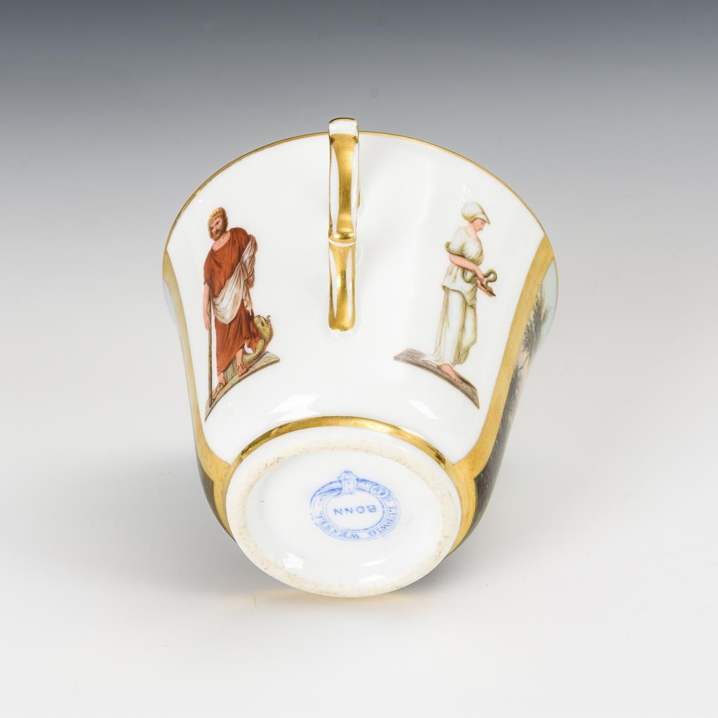 Konische Tasse mit Ohrenhenkel. Schauseitig eine Rechteckkartusche mit der Darstellung einer Stadtvedute mt Kirche und Speicherhäusern, die Ansicht flankierend Herakles mit Keule und Hygeia mit Schlange als Personifikation der Gesundheit und Schutzpatronin der Apotheker. Ohne Untertasse. Unterseitige Glasurspinne.