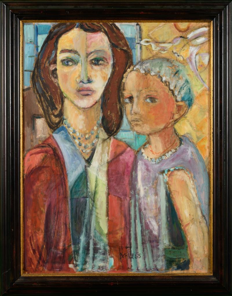 Frontal stehende junge Frau, die am Betrachter vorbeischaut, während die im Dreiviertelprofil stehende Tochter den Betrachter direkt ansieht.