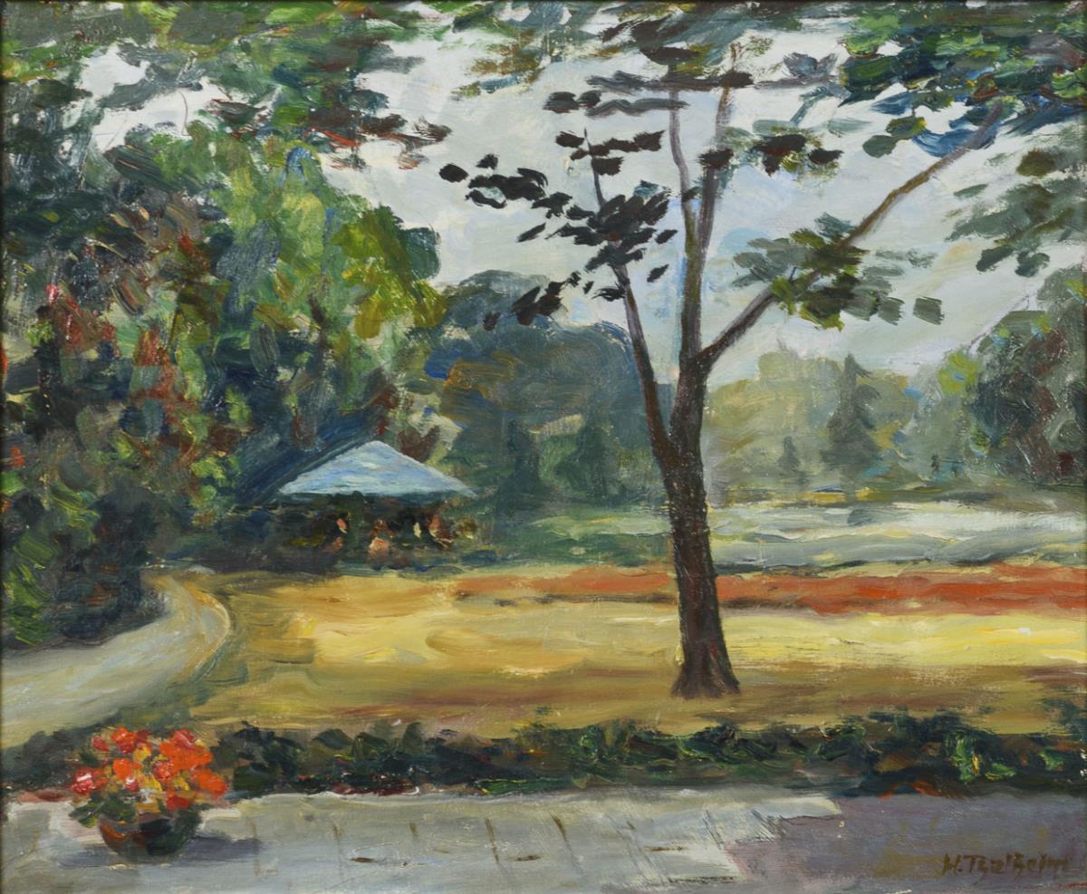 Undeutlich signiert: Impressionistische Parklandschaft mit Pavillon