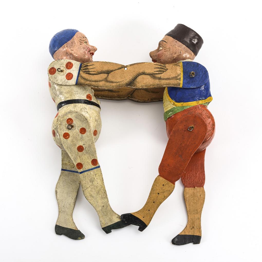2 lustige Figuren im Kampf, mit gesplinteten Gliedern. Kleine Farbdefekte, Aufhängung fehlt.