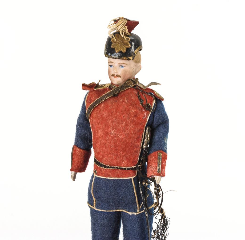 Schlanker Offizier mit gemaltem Schnurrbart und Tschapka. In rot-blauer Filzuniform. Helm mit kleinen Bestoßungen, Gamaschen/Stiefelschäfte eventuell ergänzt.