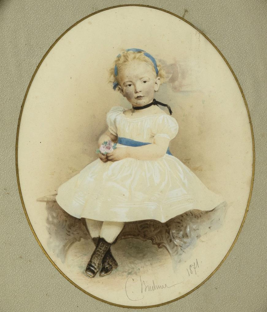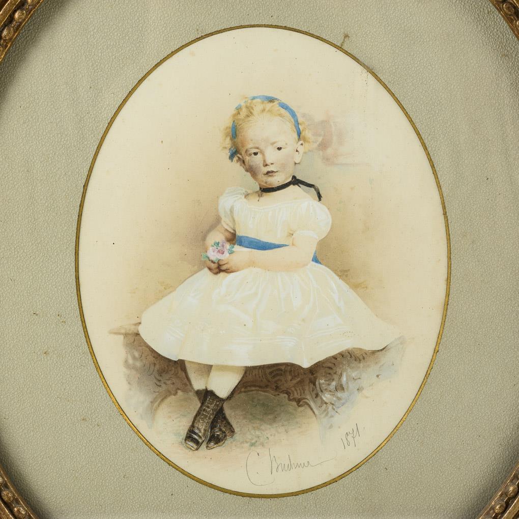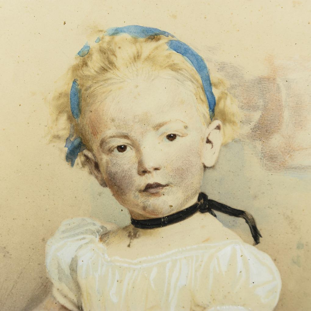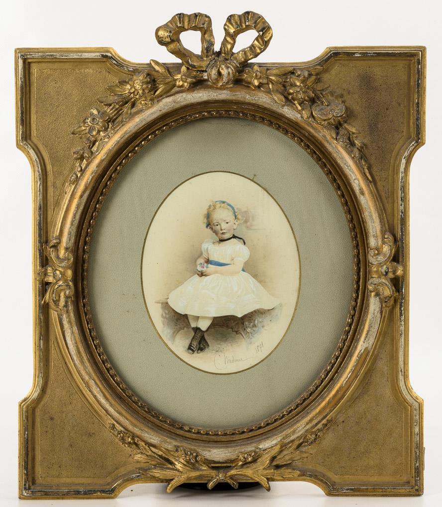Porträt eines kleinen Mädchens im weißen Kleid mit blauer Schleife. Goldrahmen partiell berieben, Schleife einseitig geklebt.