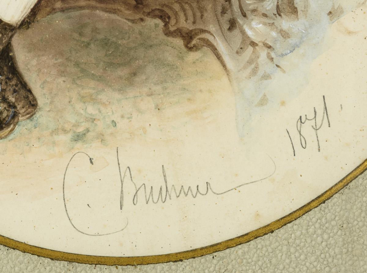 Aquarell/Gouache über Zeichnung oder Umrissradierung. Mittig unten signiert. Datiert: 1871.