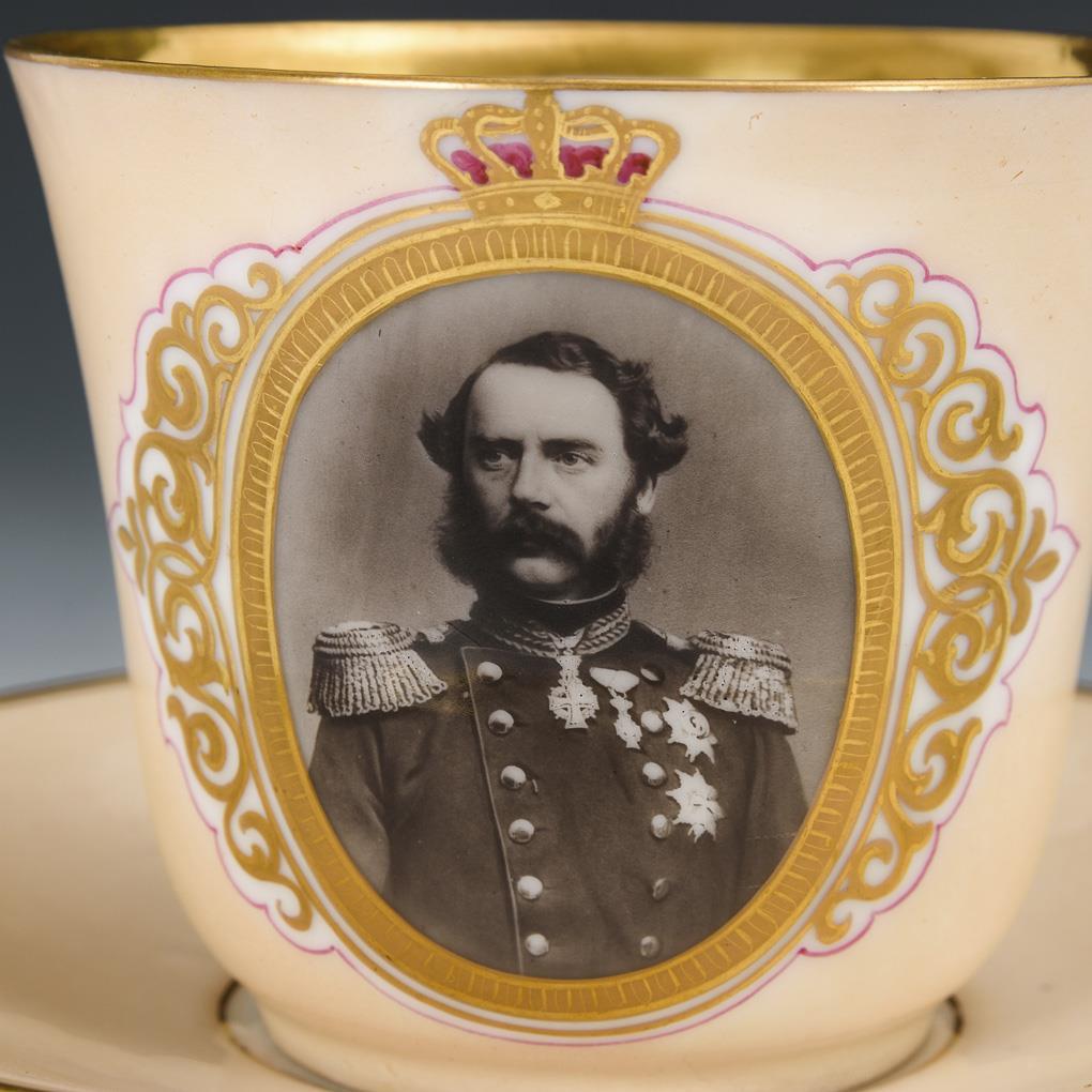 Konische Tasse mit Ohrenhenkel. Schauseitig ein Medaillon mit dem Bildnis des dänischen Königs Christian XI.. Untertasse mit Randrestaurierung und Haarrissspinne im Spiegel.