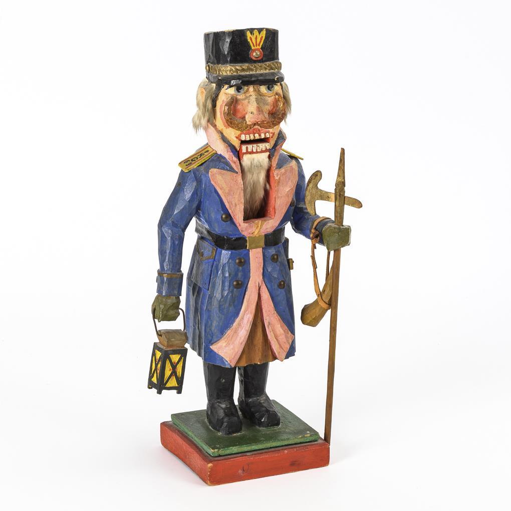 Außergewöhnlicher Nussknacker als Nachtwächter, mit Laterne, Hellebarde und Horn. Leichte Altersspuren.