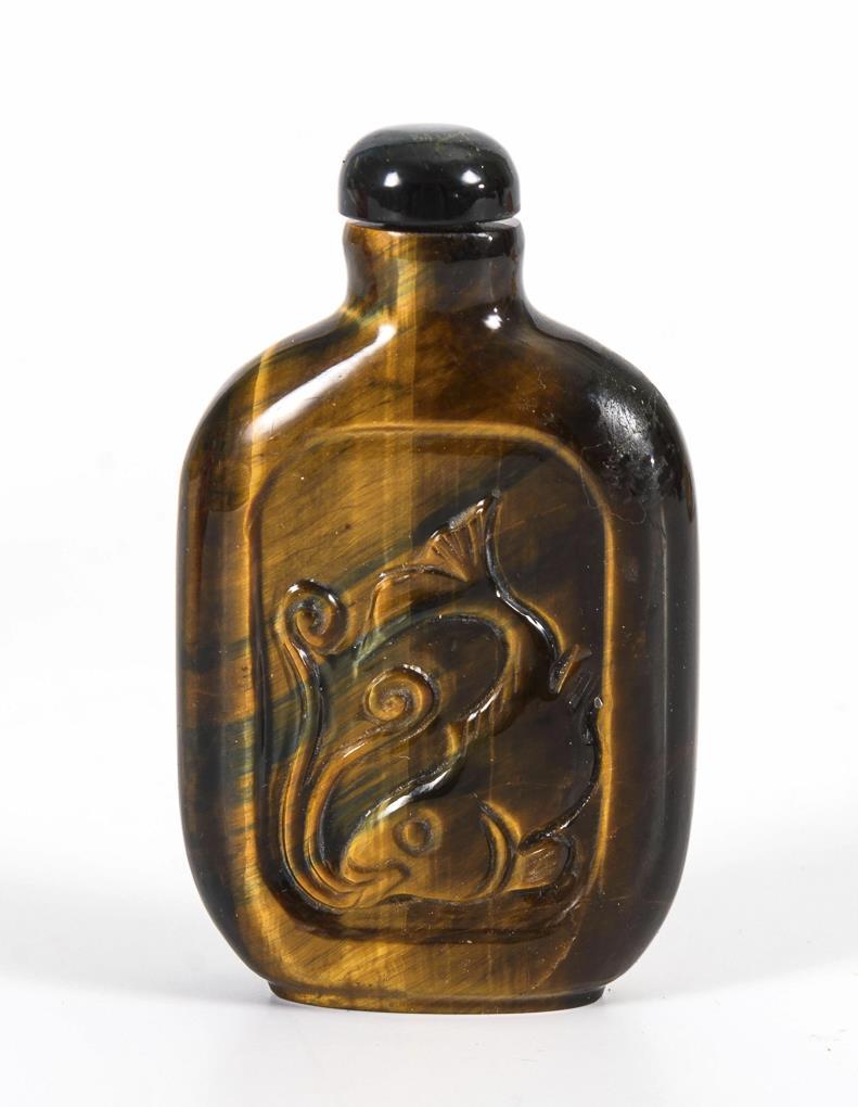 Große Flasche mit rotem Überfang. Rehe und Kranich in Landschaft, sowie Schriftzeichen. Stöpsel aus kleinen Korallenkugeln. / Flache Flasche aus Tigerauge mit flachem Fischrelief. / Flasche in Form eines Fisches aus durchsichtigem, leicht lachsfarbenem Glas, Cabochonstöpsel.