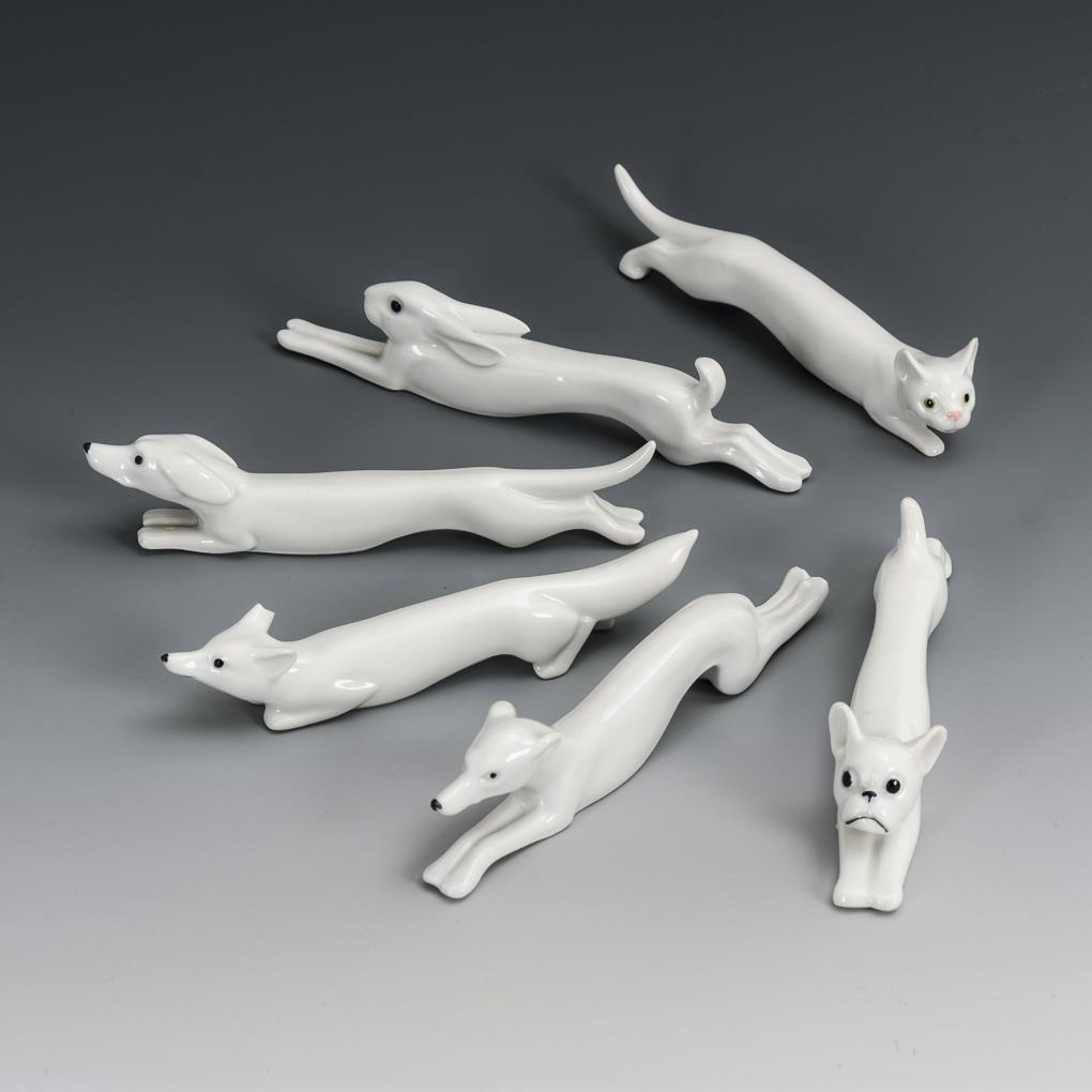 Messerbänkchen als Hase, Dackel, Fuchs, Windhund, Boxer und Katze. 1 Fuchsohr bestoßen.