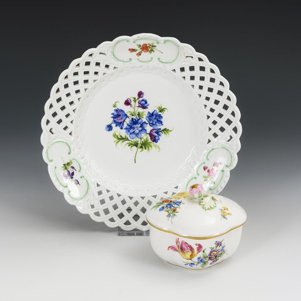 Durchbruchteller und Zuckerdose mit Blumenmalerei. Meissen.
