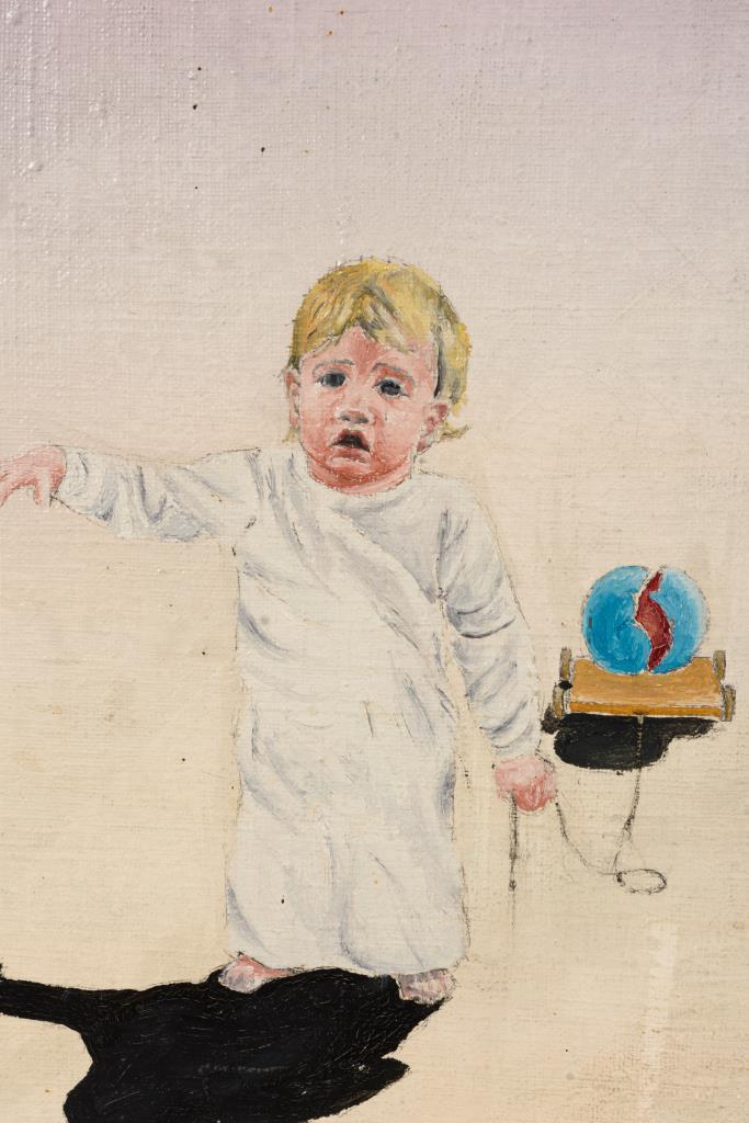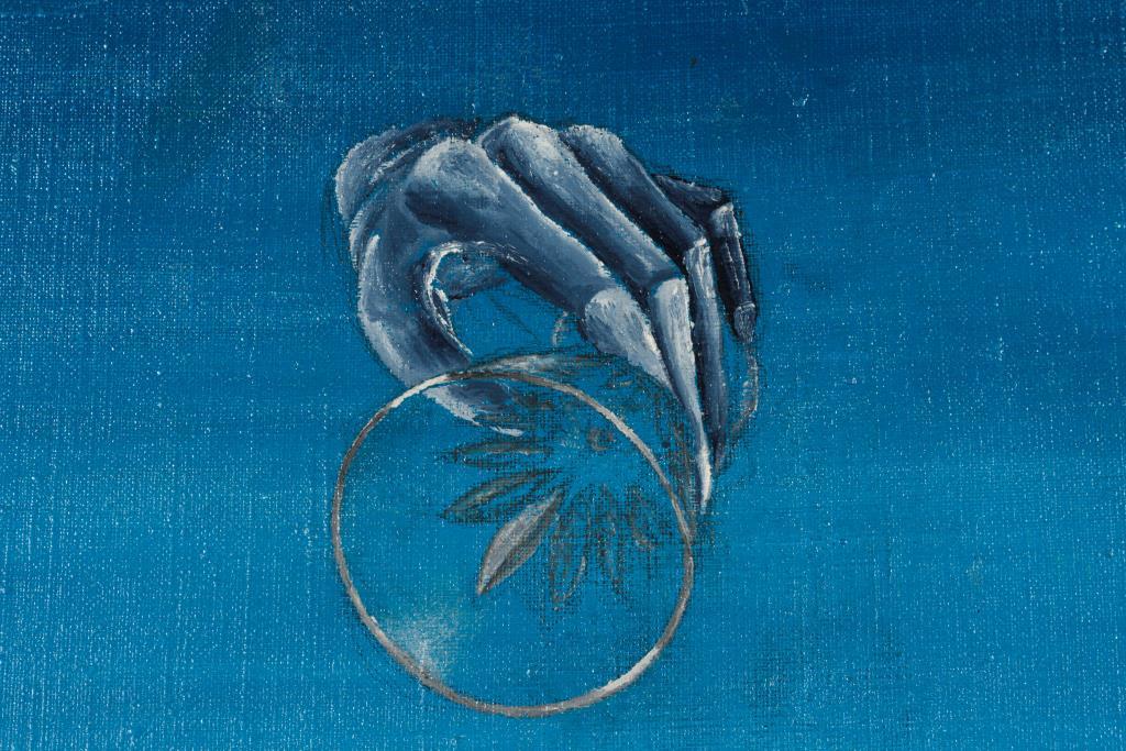 Surrealistische Szene mit kleinem Kind nahe einer gläsernen Skulptur sowie einer "göttlichen" Hand, welche ein Glas gekippt hält, darunter ein roter See.
