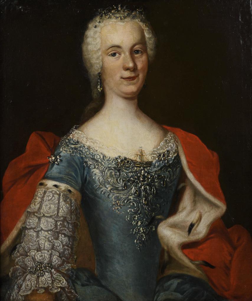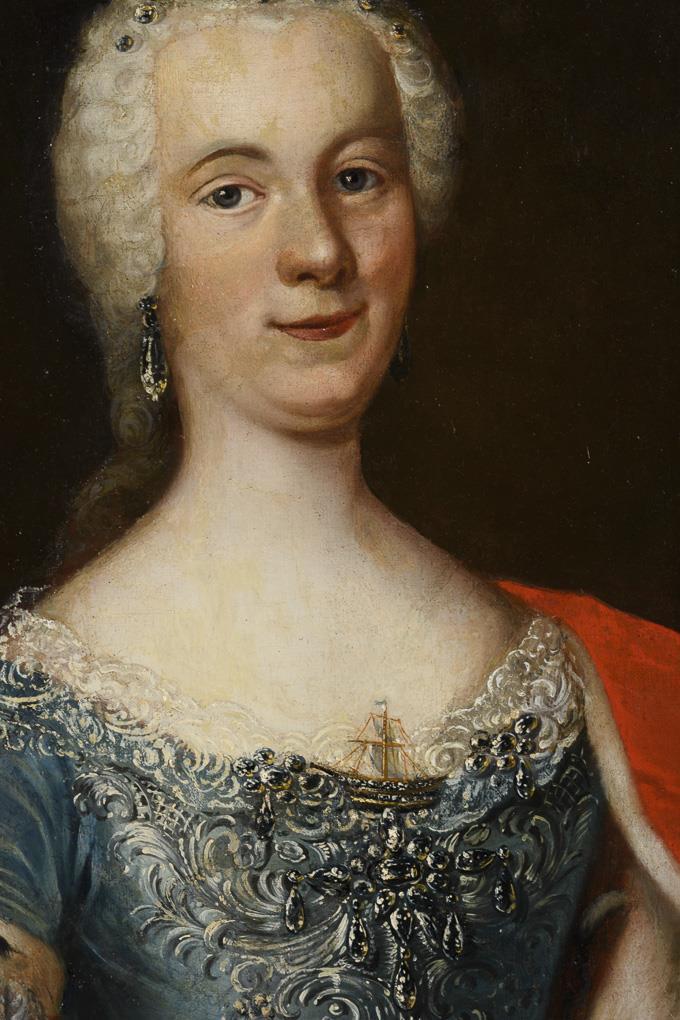 Porträt einer adligen Frau im blauen Kleid mit rotem Hermelinmantel und weißer Perücke. Leinwand doubliert.