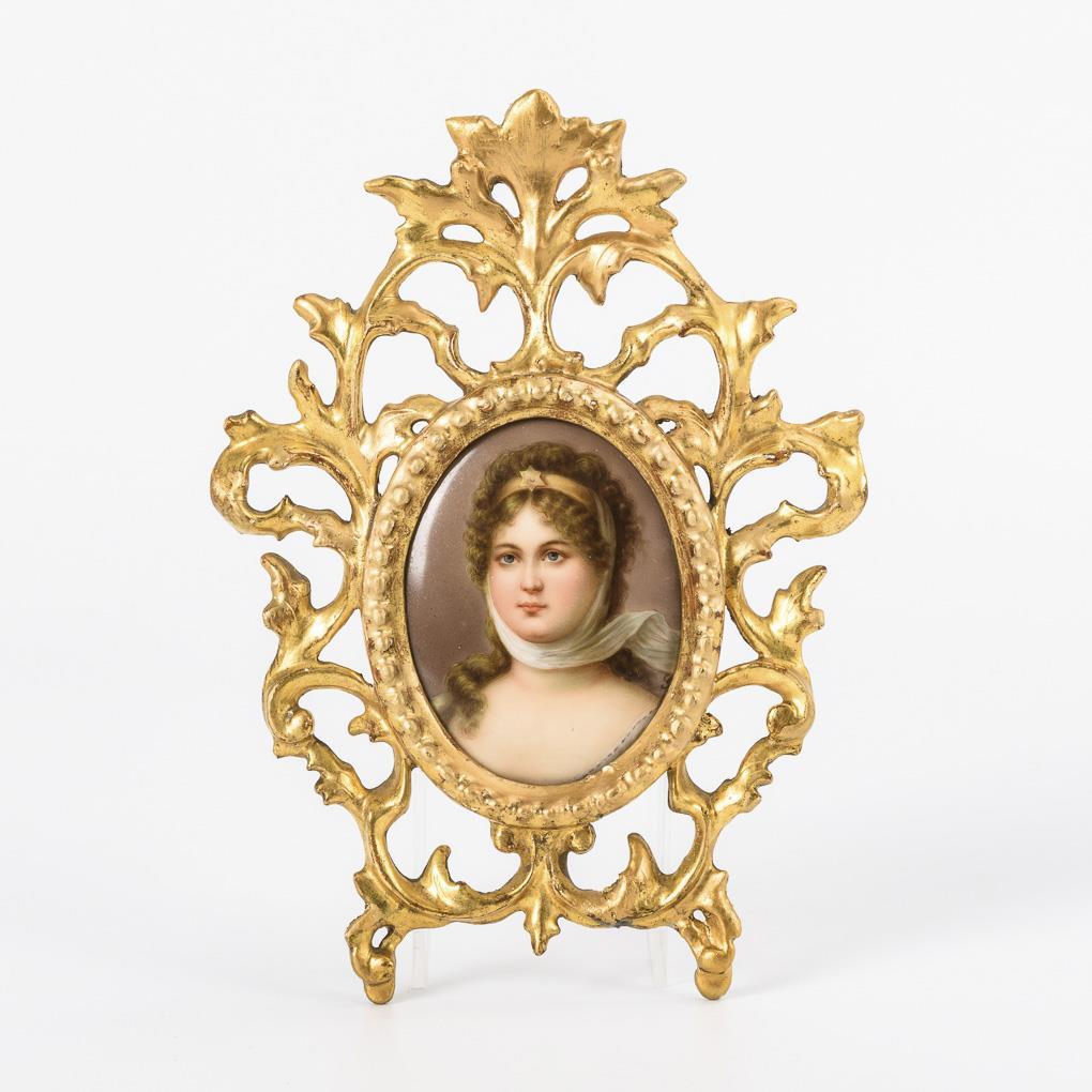 Polychrome Malerei über Vordruck. L 8,5 cm, im dekorativen Goldstuckrahmen (L 21,5 cm).