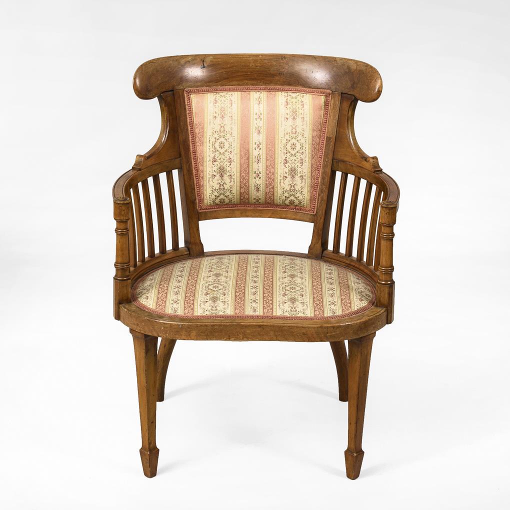 Armlehnstuhl in gebogter Form, mit verstrebten Armlehnen und schaufelförmiger, teils gepolsterter Rückenlehne, gestreifter Bezug mit Blumenranken. Alters-/Gebrauchsspuren, Polster und Bezug ergänzt.