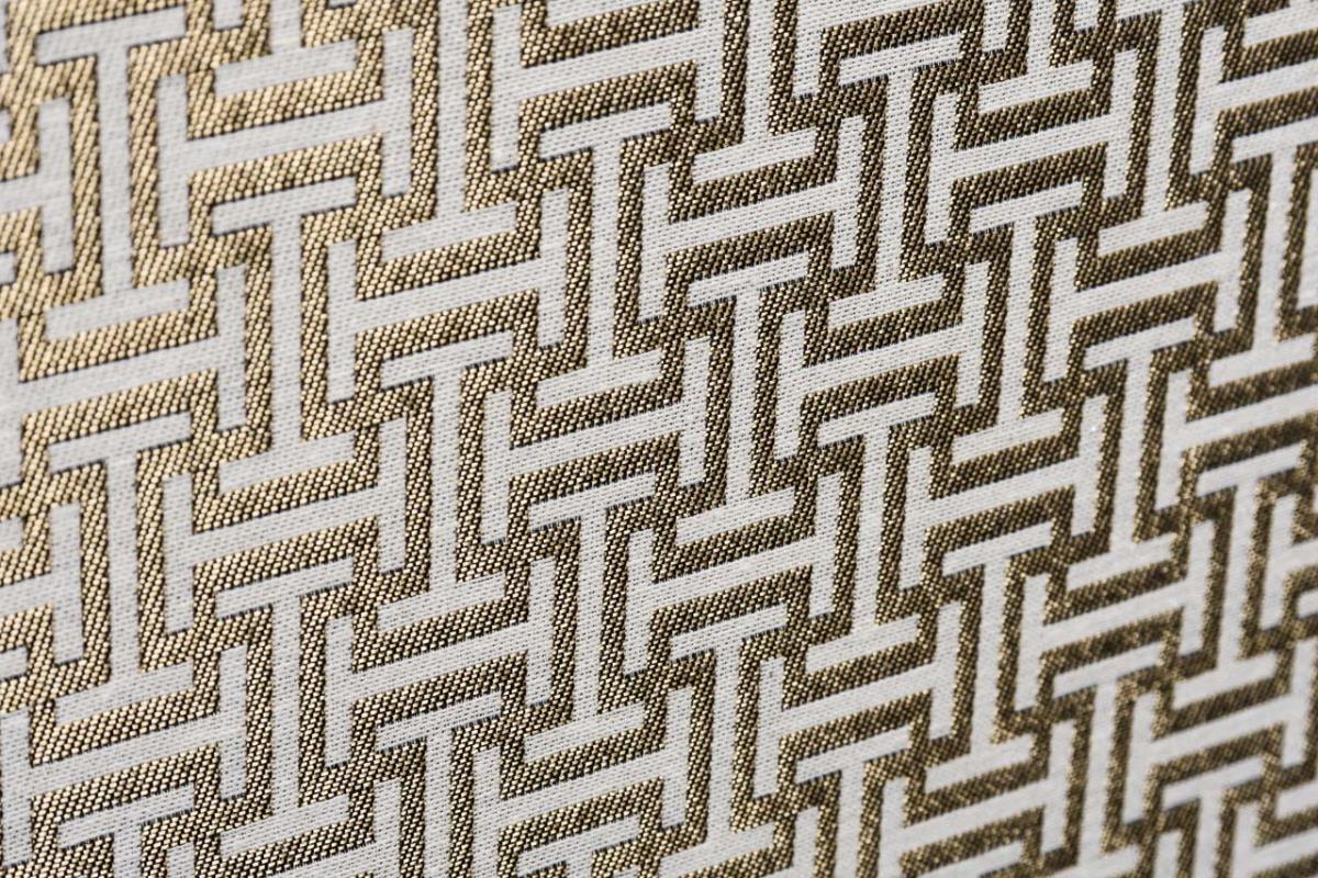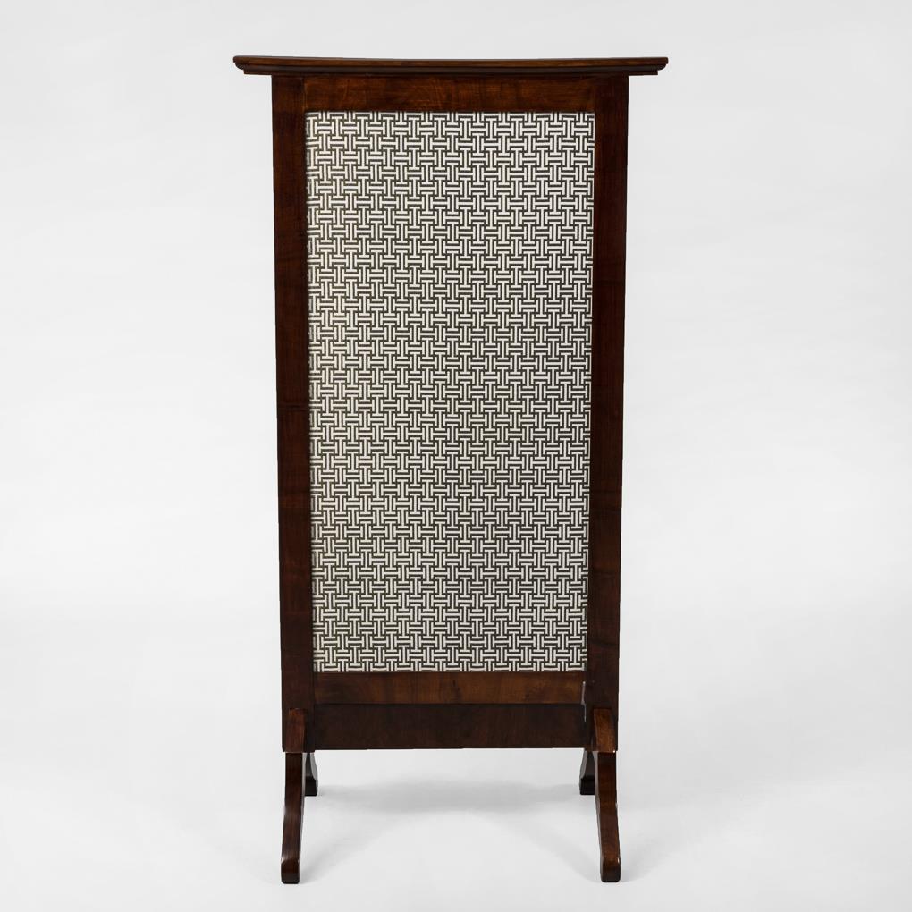 Raumteiler im Japonismus-Design auf volutierten Füßen, heller Bezug mit geometrischem Rapport. Minimale Alters-/Gebrauchsspuren, restauriert, einige Furnierblasen, Leimspuren im Fußbereich, Bezug passend ergänzt.