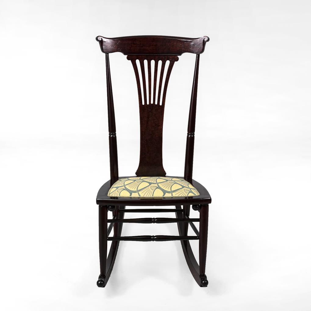 Schaukelstuhl mit gepolsterter Sitzfläche und teils à jour gearbeitetem Mittelbrett, Beine sprossenverstrebt, Bezug mit stiltypischen Ornamenten. Furnier schwundrissig, wohnfertig restauriert, Bezug passend ergänzt.