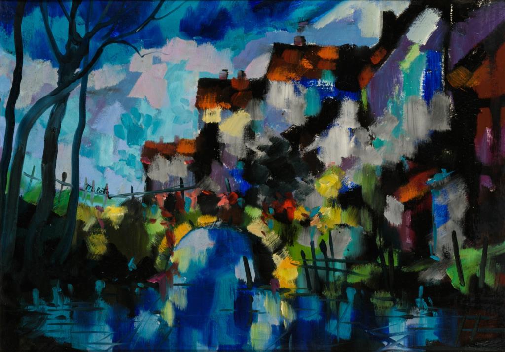 Expressiv und farbenfroh gemalte Brücke über einen Fluss am Stadtrand.