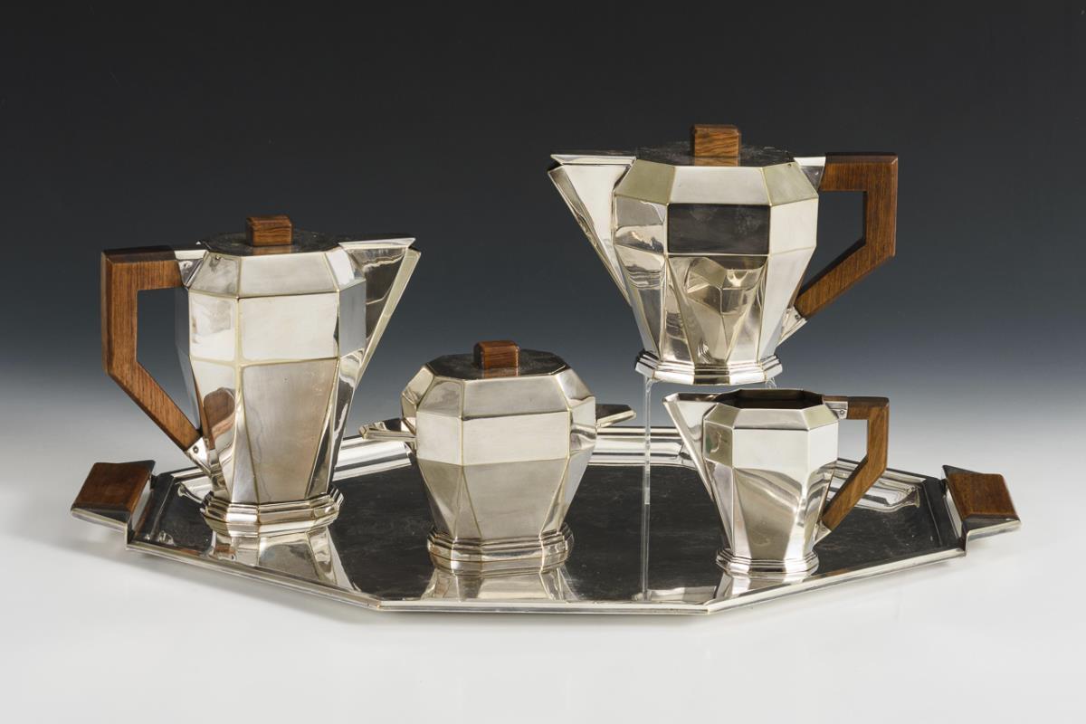4-teiliges Kernstück mit facettierter Wandung und Eichegriffen. Auf achteckigem Tablett. Leichte Altersspuren und kleine Dellen, Tablett mit leichten Kratzern.