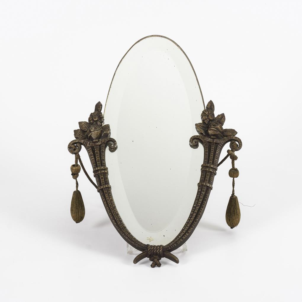 Ovales Spiegelglas in der Halterung aus schlanken Füllhörnern mit Blüten. Punktuelle Blindflecken am Spiegelglas.