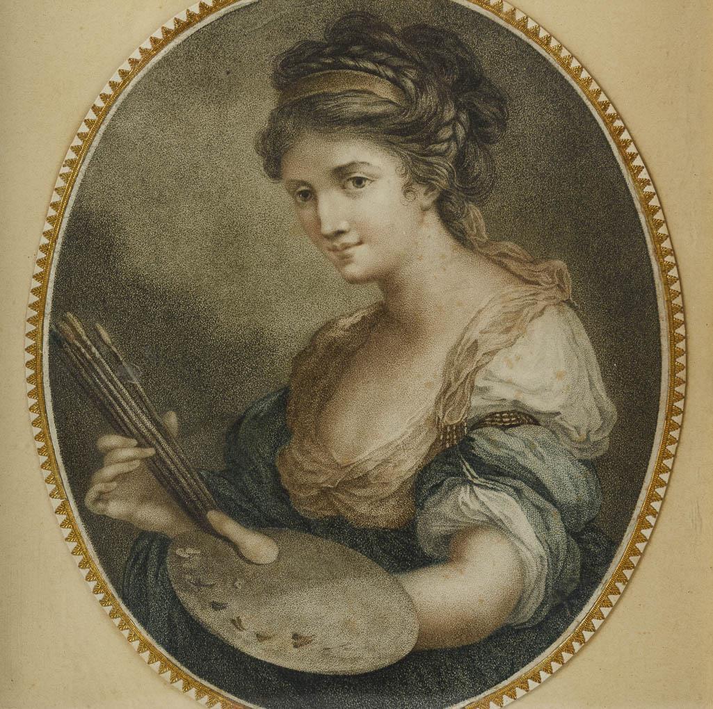 Tief gekehlte Rahmen mit Goldstuck-Blattleiste innen. Je ovale Farblithografie: Selbstbildnis Angelika Kauffmann bzw. Flora. Wenige Alters-/Gebrauchsspuren am Rahmen, Papier gebräunt bzw. stockfleckig.