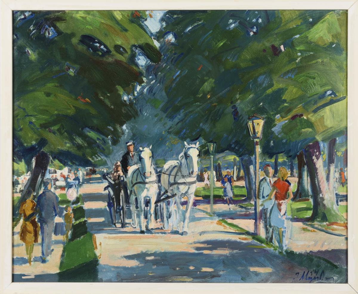Viele Menschen im Sonnenschein auf dem Parkgelände mit der fahrenden Kutsche auf der Straße.