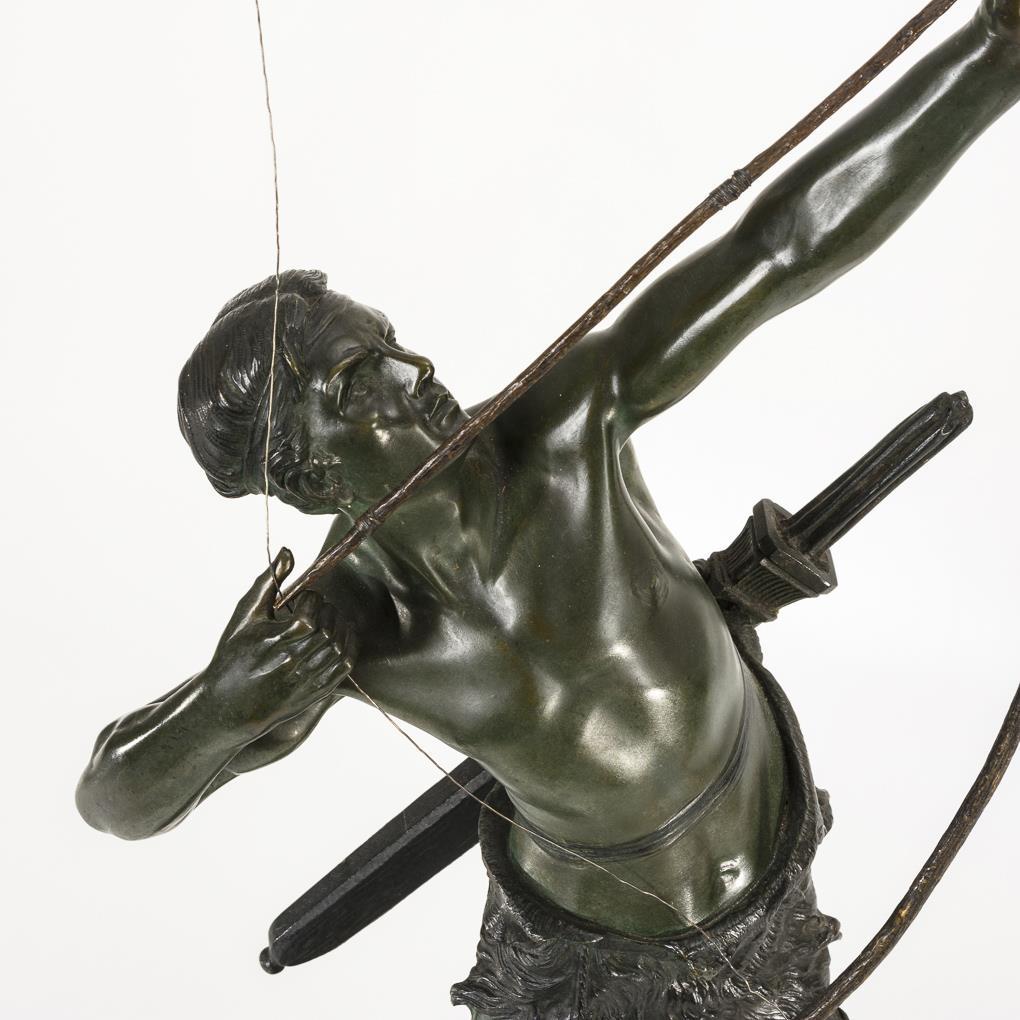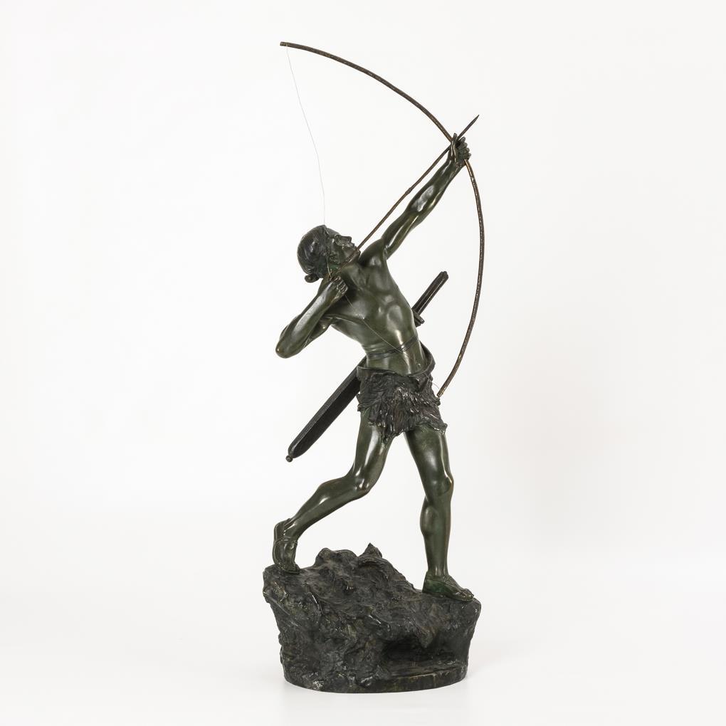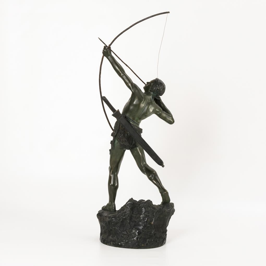 Jugendlicher Jäger im Fellschurz, der entschlossen und kraftvoll seinen Bogen spannt. Geringe Lötspuren an originalem Pfeil und Bogen, sonst kaum Alters-/Gebrauchsspuren.