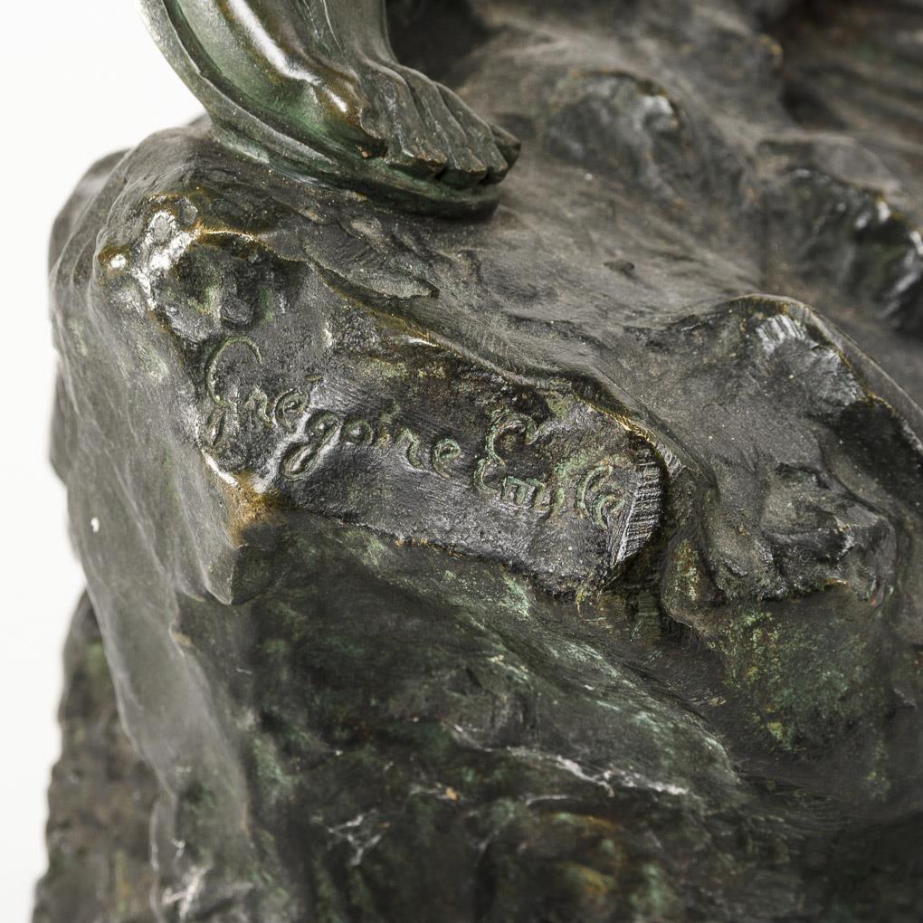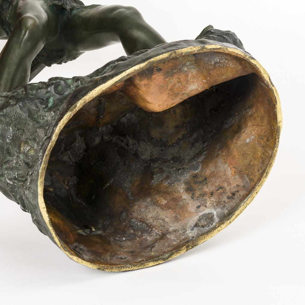Bronze grünlich und schwarzbraun patiniert. Bezeichnet. H 86 cm (mit Bogen).