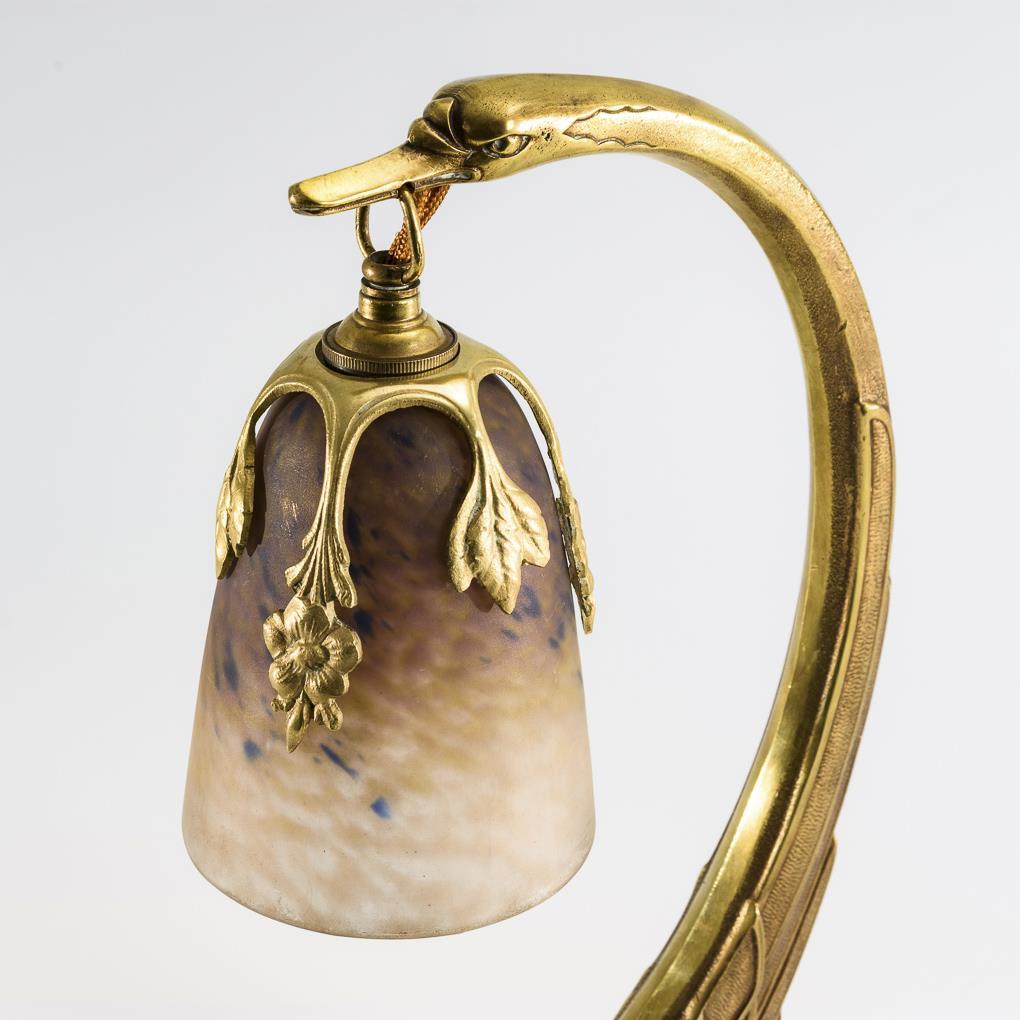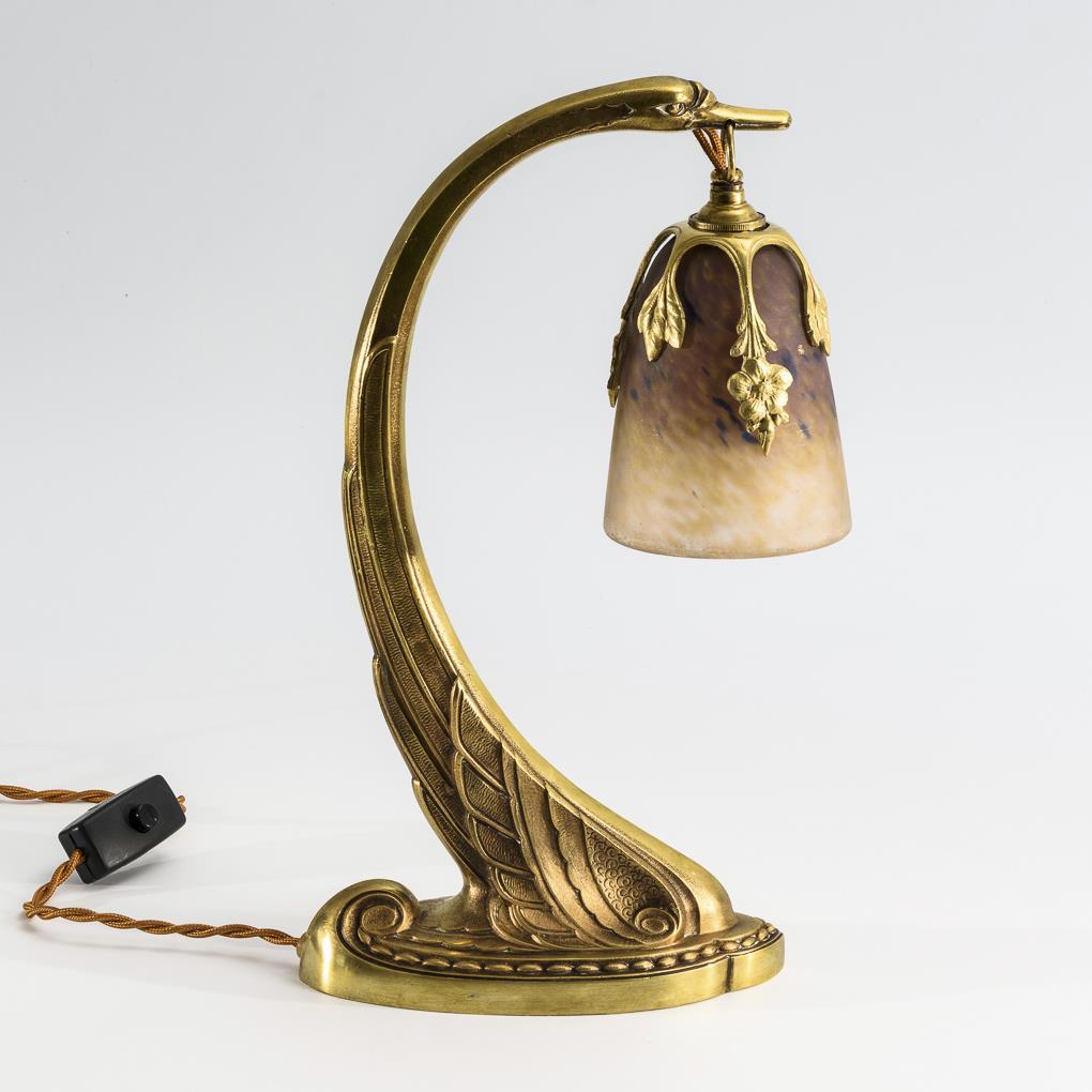 Gehängter Glockenschirm mit floraler Einfassung (H 12,5 cm). An gebogenem Schwanenschaft mit rautenförmigem Fuß. Elektrifiziert (Funktion nicht geprüft) .