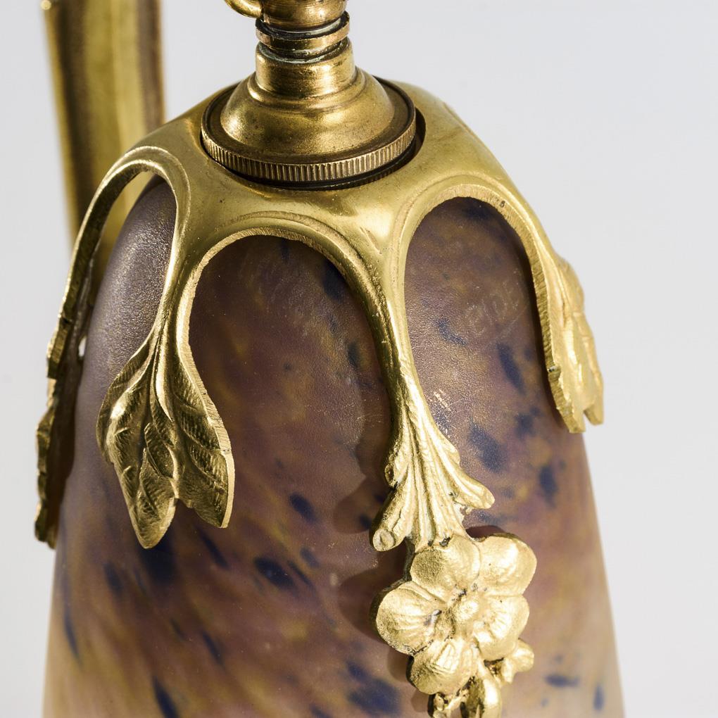 Farbloses, mattiertes Glas mit opalweißen, violetten und blauen Pulvereinschmelzungen; Bronze. H 37 cm.