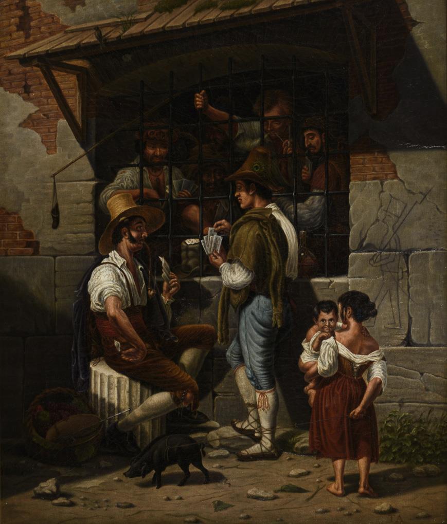 Männer vor dem Gefängnis, mit den Insassen durch das Gitter Karten spielend. Eine restaurierte Stelle mit Hinterklebung.