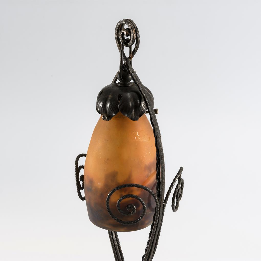 Glockenschirm, eingehängt in ein schmiedeeisernes Gestell mit Volutenzier sowie dreiseitigem Fuß mit plastischen Rosen. Elektrifiziert (Funktion nicht geprüft).