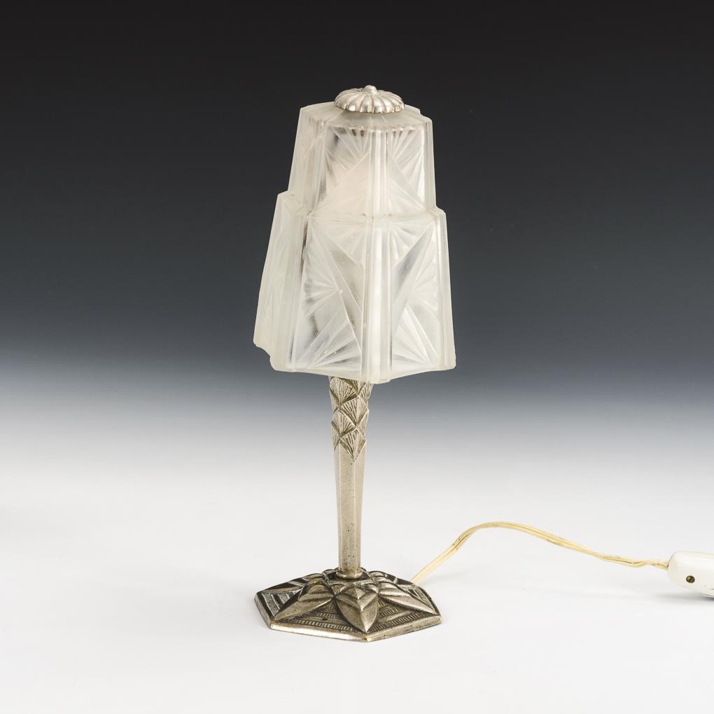 6-eckiger Fuß und Schaft mit Blattzier, 6-eckiger Glasschirm abstrakt reliefiert, 1-flammige Bajonettfassung mit Verkabelung und Schalter. Funktioniert. Abplatzer oder Gußfehler am Glas, Vernickelung berieben.