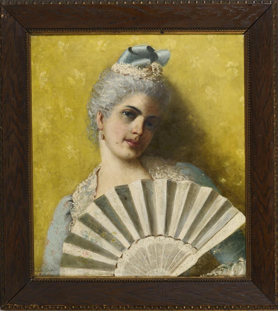Porträt einer jungen Frau in der Mode des späten 18. Jh. mit weißem Fächer. Eine restaurierte Stelle.