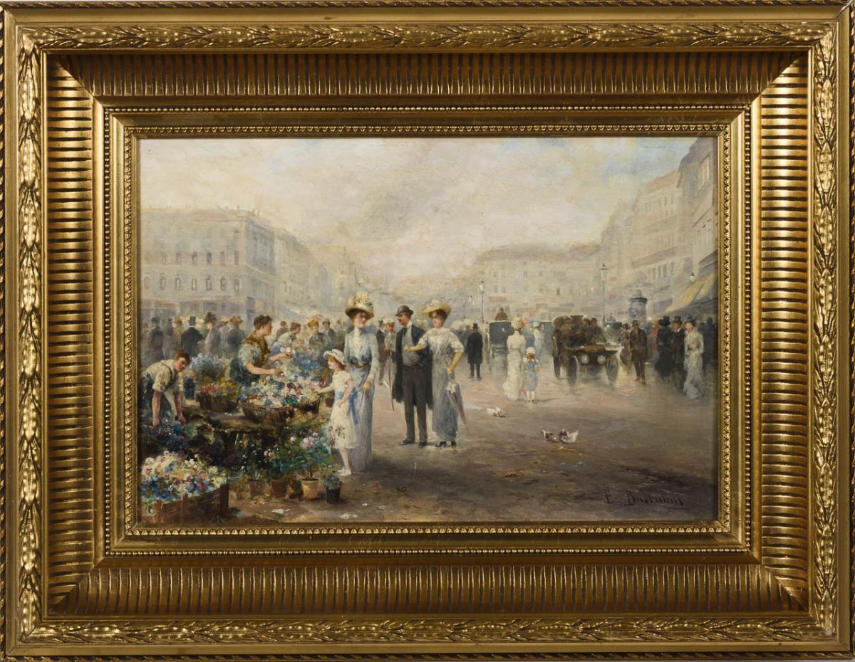 Reges Treiben auf dem Platz mit den vielen Blumenhändlern und vorbei fahrenden Automobilen. Leichte Altersspuren.