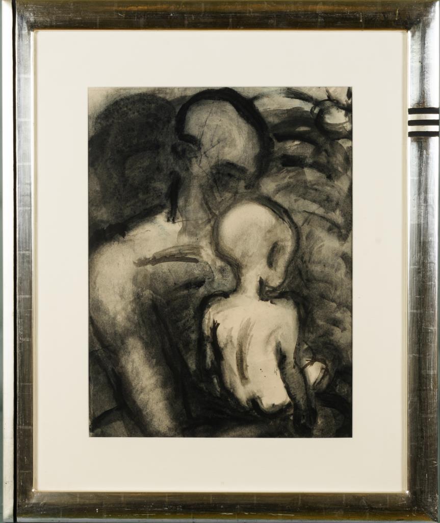 Abstrahiertes Bildnis eines Erwachsenen mit Kleinkind.