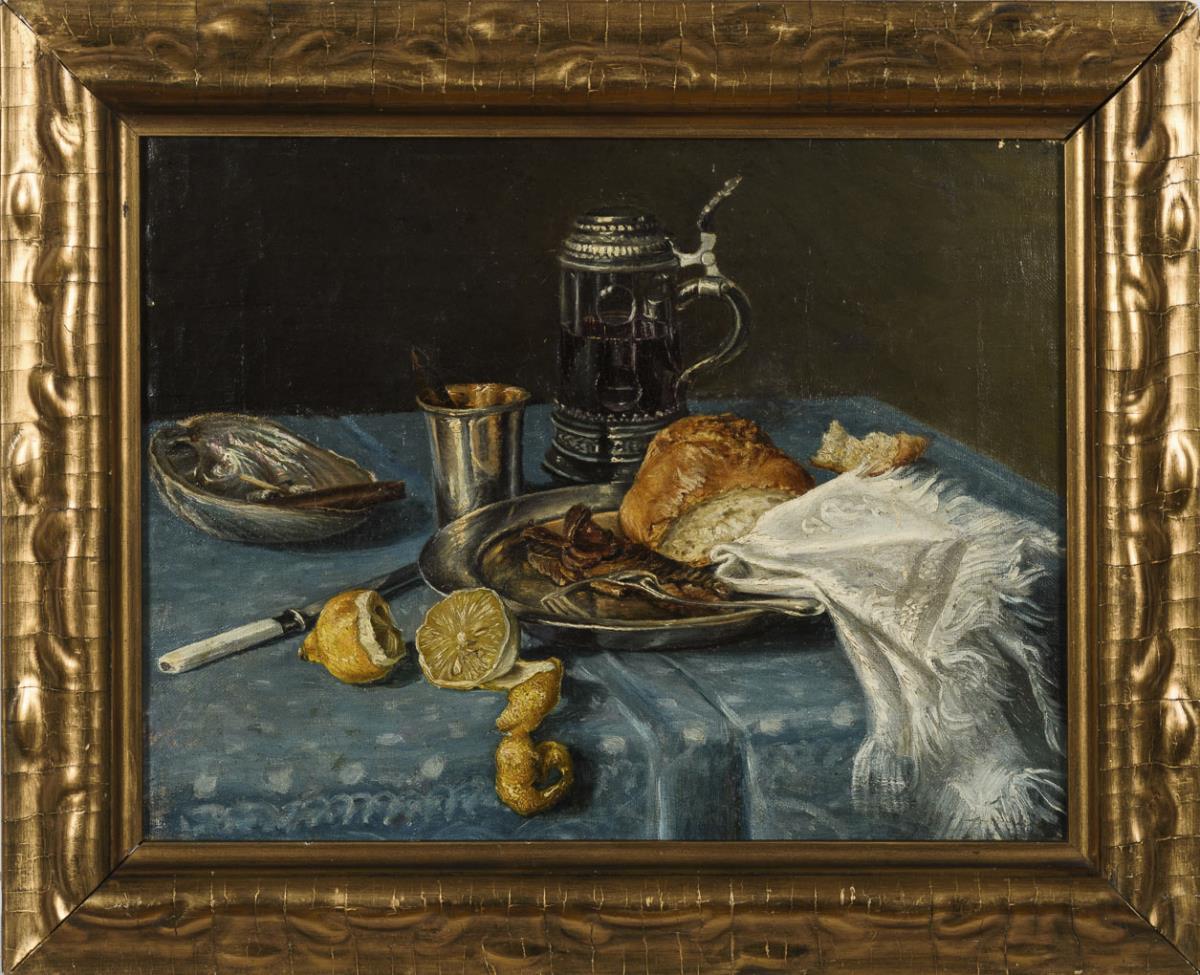 Im Stil der Alten Meister gehaltenes Stillleben mit Fisch und Semmel auf einem Teller neben geschälter Zitrone und Weinkrug. Eine kleine restaurierte Stelle mit Hinterklebung.