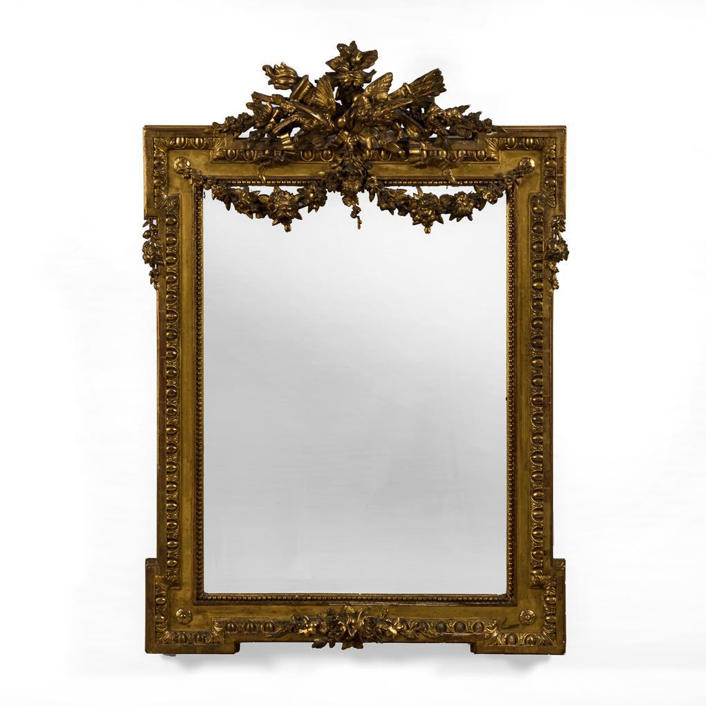 Üppig verzierter Wandspiegel mit klassizistischer Ornamentik, bekrönt mit plastischer Vogel- und Blumenschnitzerei und Festons, rechteckiger Spiegel mit facettiert geschliffenem Glas. Alters-/Gebrauchsspuren, Stuck mehrfach geklebt, Goldfassung berieben, Spiegelglas wohl alt ergänzt mit kleinen blinden Flecken.