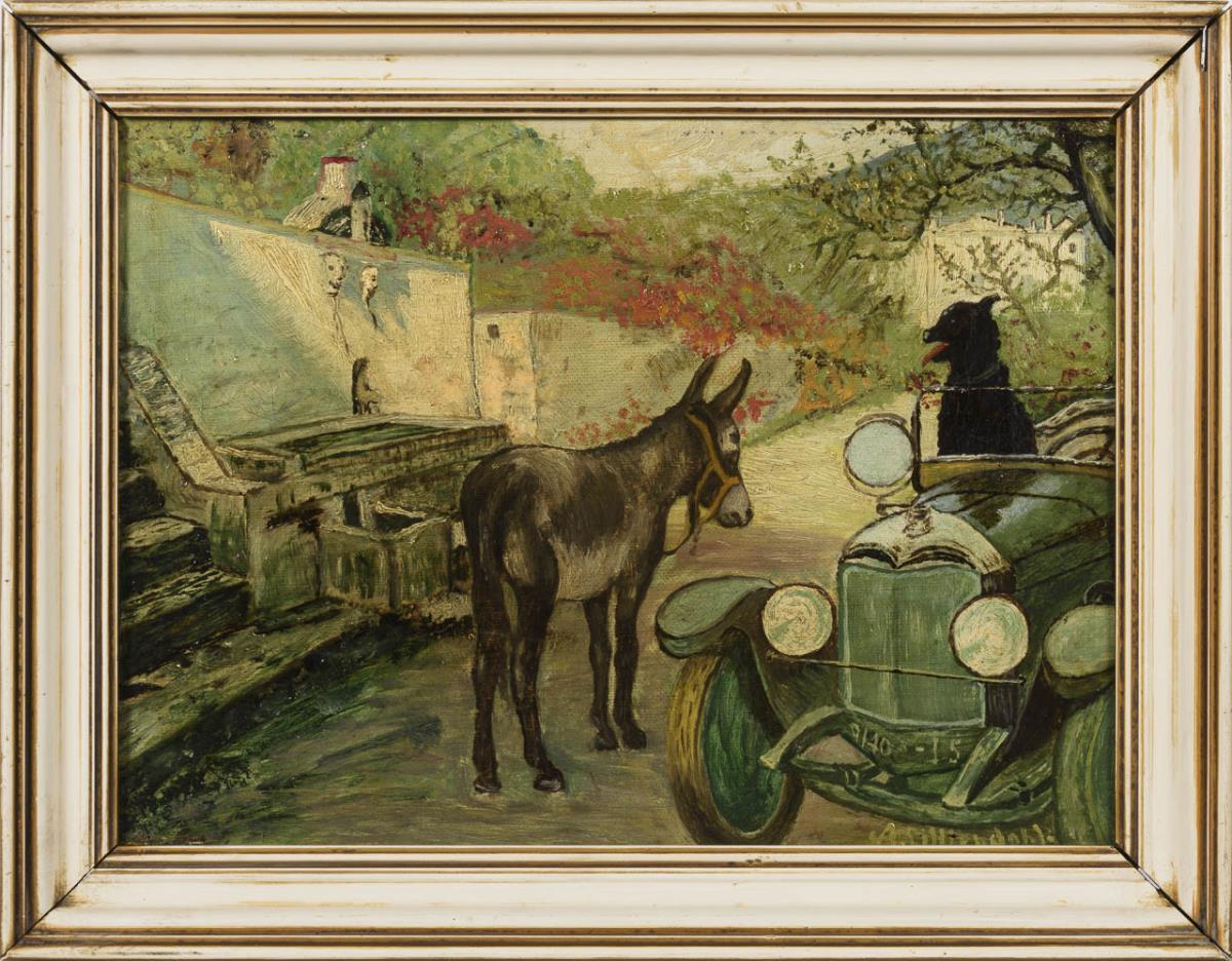 Genreszene mit Esel bei einem Automobil mit einem Hund. Eine kleine restaurierte Stelle mit Hinterklebungen.