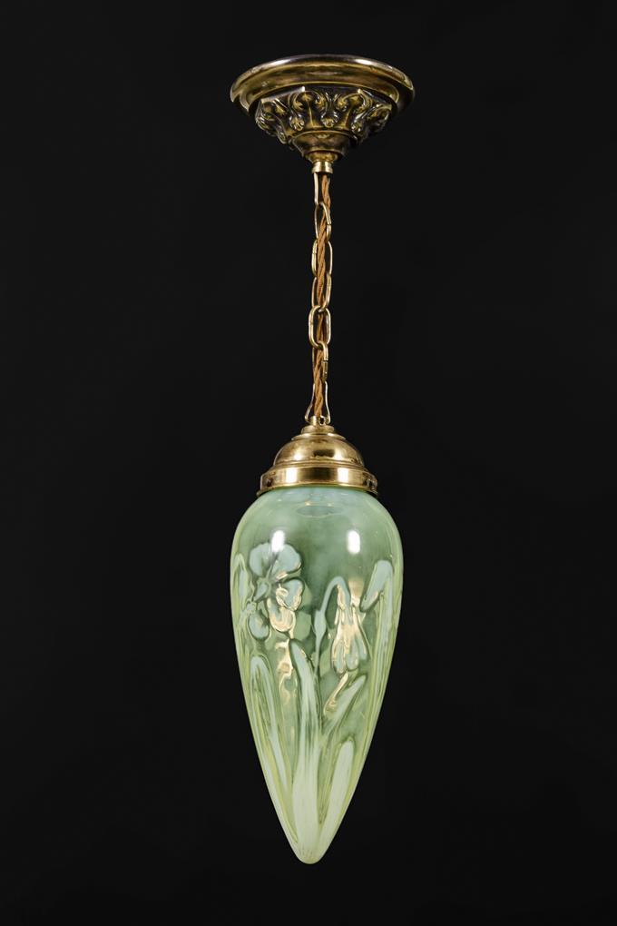 1-flammige Deckenlampe mit Kettenaufhängung, Rosetten-Baldachin und grün-irisierendem zapfenförmigem Glasschirm mit Blumendekor. Leichte Alters-/Gebrauchsspuren.