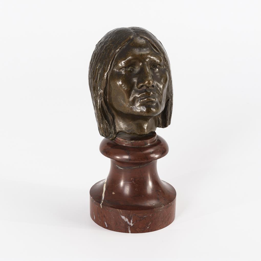 Entschlossen blickender Ureinwohner Nordamerikas (Sioux Phillip, Sohn von "Kicking Bear"?) . Minimale Abplatzer am Sockel.