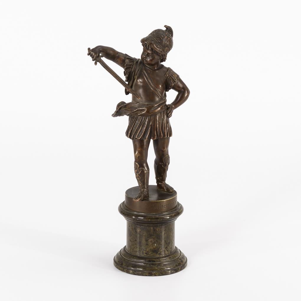 Wohl der kindliche Kriegsgott Mars, der sein Schwert beschaut. Schwert gering verbogen und mit minimalem Haarriss, sonst kaum Alters-/Gebrauchsspuren.