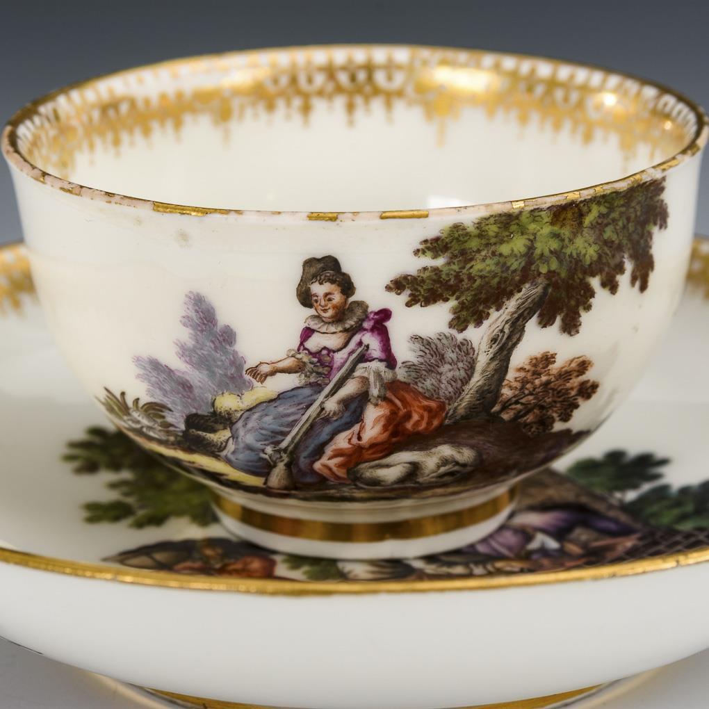 Beidseitig auf dem Koppchen eine Jagdszene, im Spiegel der Untertasse die Darstellung von Bauarbeitern beim Turmbau. Minimaler Goldabrieb am Mündungsrand des Koppchens, unterseitige Restaurierung am Untertassenrand.