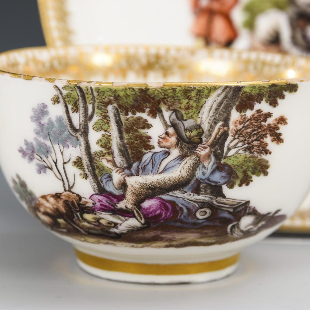 Tasse und Untertasse mit Jagdmotiv und Baumotiv. Meissen.