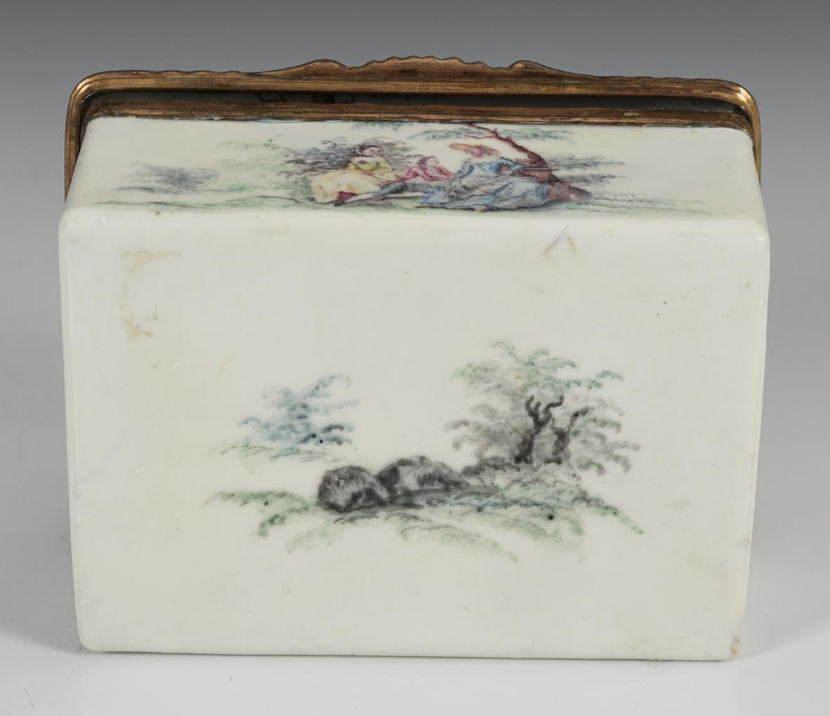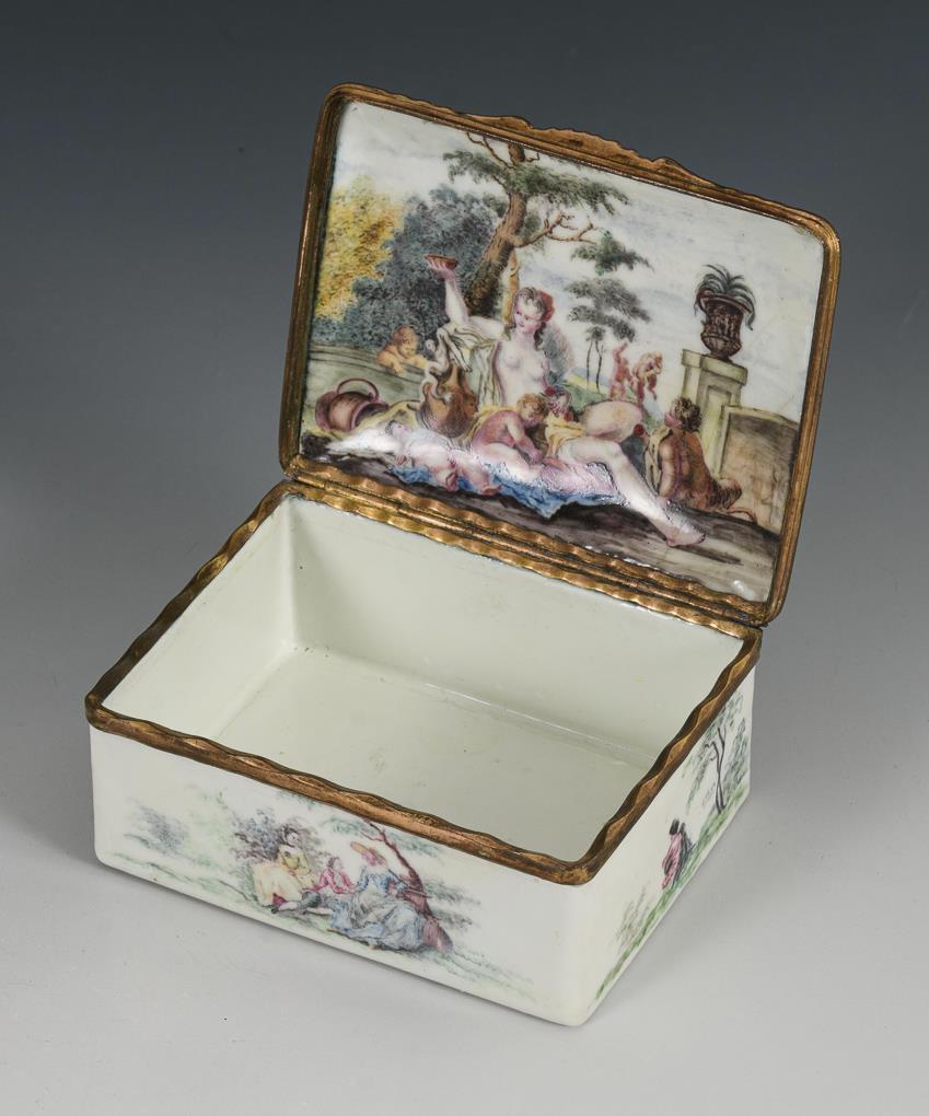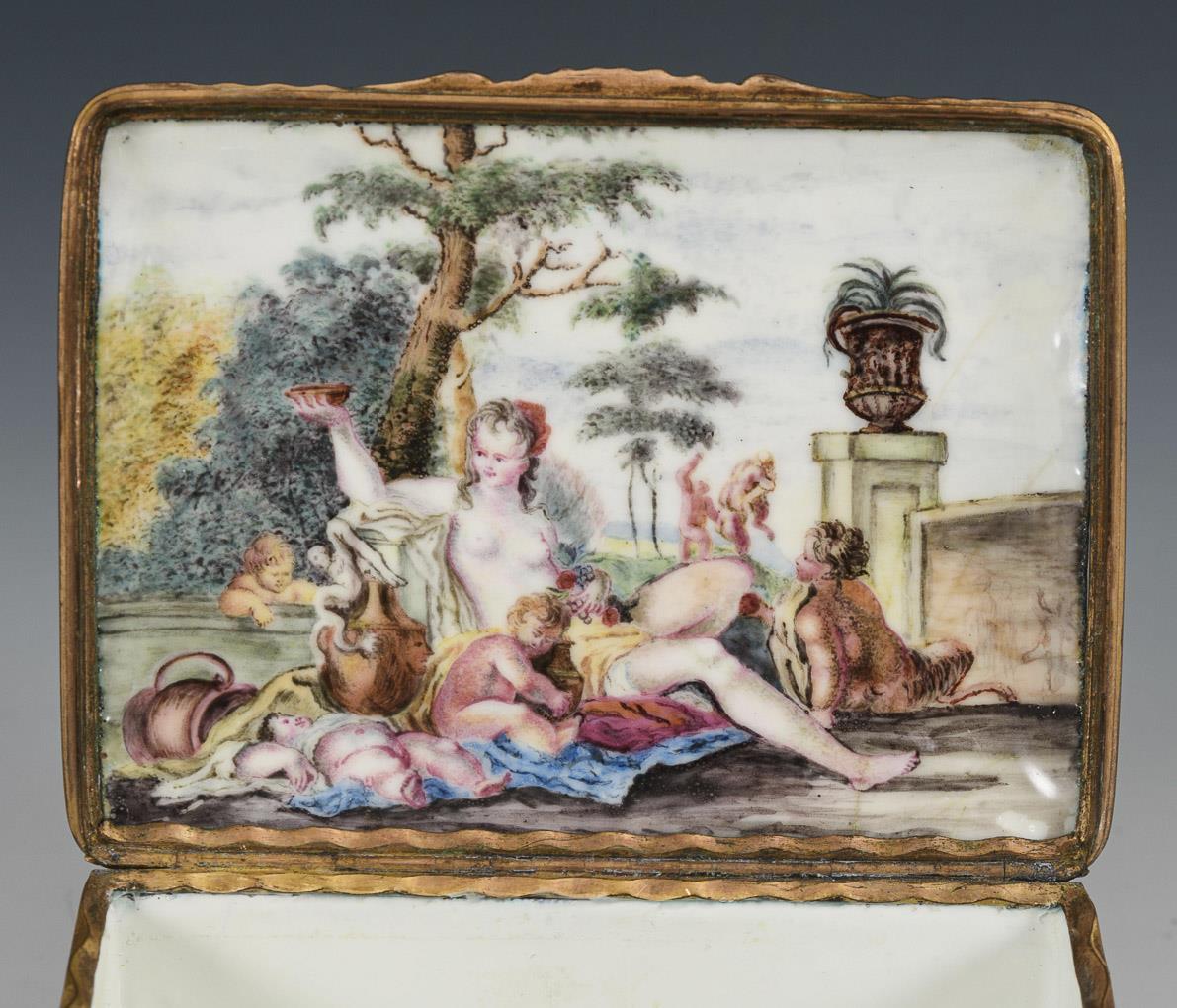 Quaderdose allseits mit Figuren in Landschaften bemalt; auf dem Boden nur eine Landschaft. Auf dem Scharnierdeckel galante Szene mit Schäferin im Park; im Deckel bacchantisches Gelage mit zentraler Nymphe.