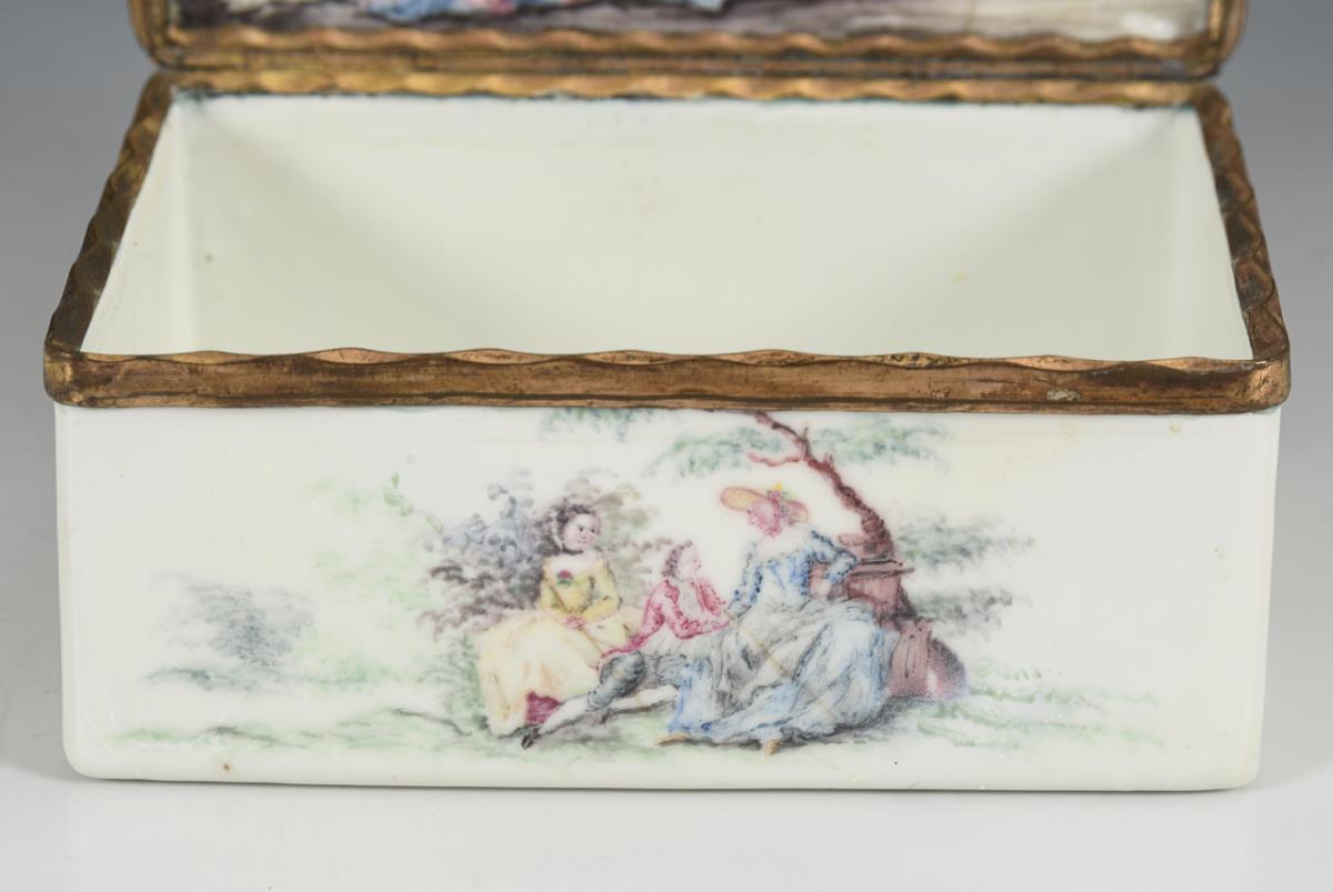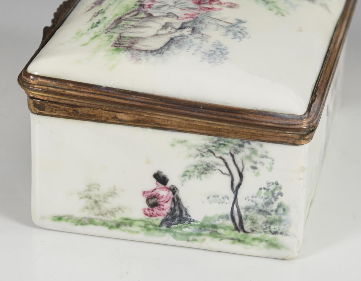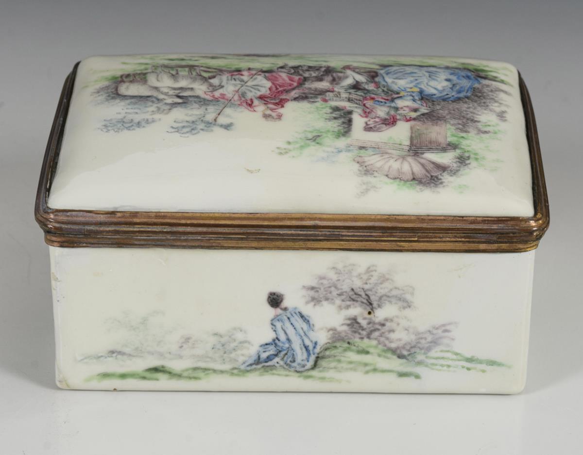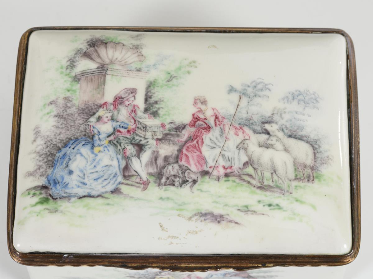 Quaderdose allseits mit Figuren in Landschaften bemalt; auf dem Boden nur eine Landschaft. Auf dem Scharnierdeckel galante Szene mit Schäferin im Park; im Deckel bacchantisches Gelage mit zentraler Nymphe.