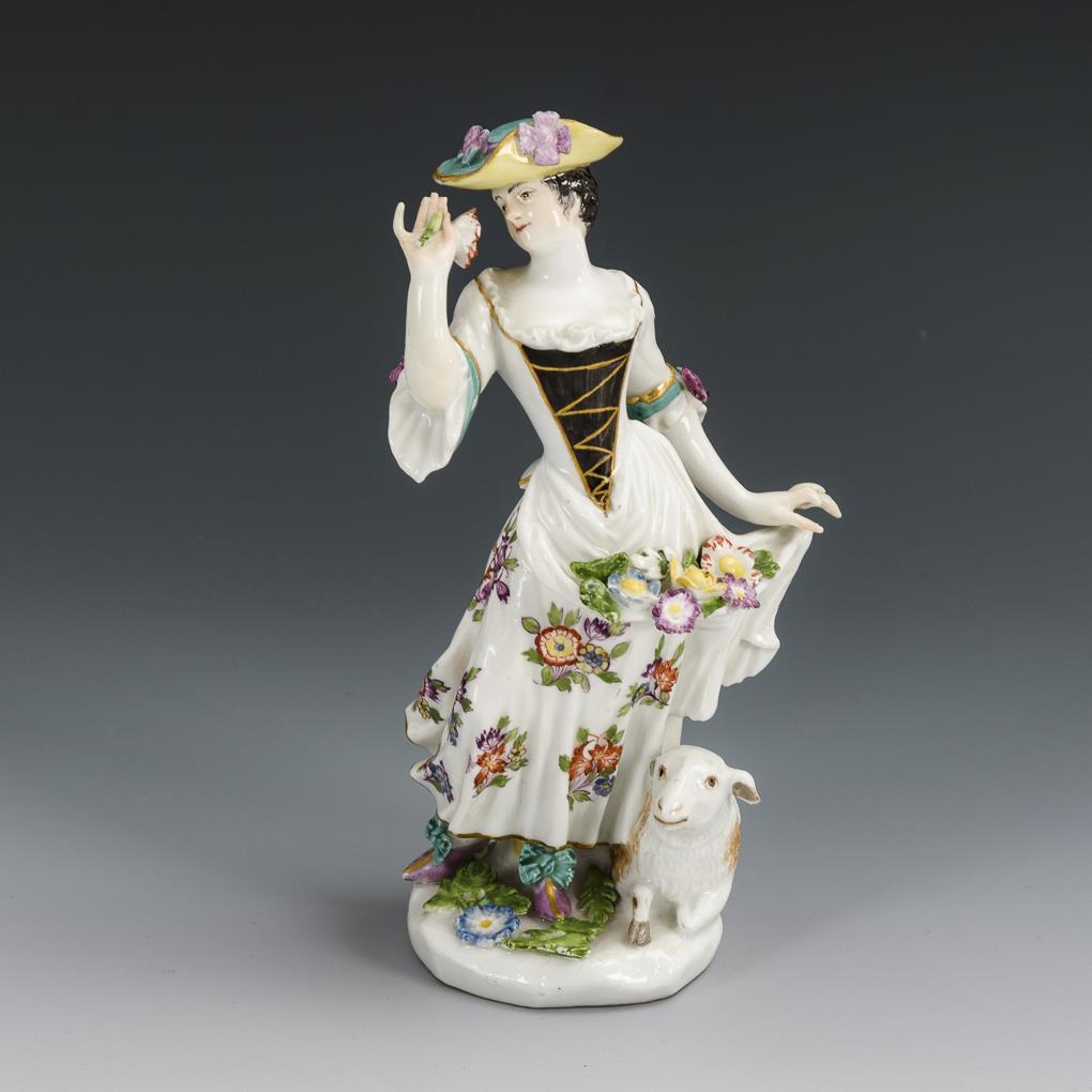 Schäferin mit blütengefüllter Schürze und Schaf. Linke Hand und Zeigefinger der rechten Hand restauriert, partiell kleine Bestoßungen an den Blüten.