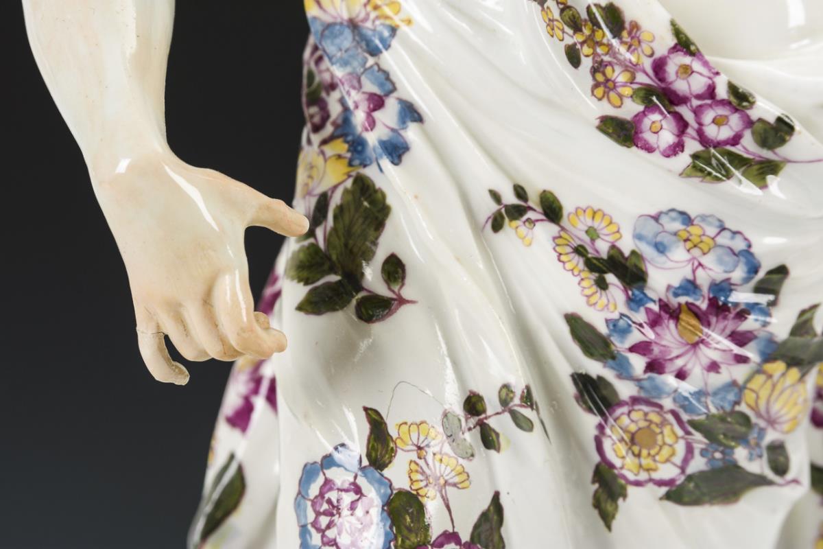 Stehende Göttin mit Umhang und Blumenstrauß. Restaurierte Bruchstellen, Bestoßungen am Belag, kleiner Finger der rechten Hand geklebt.