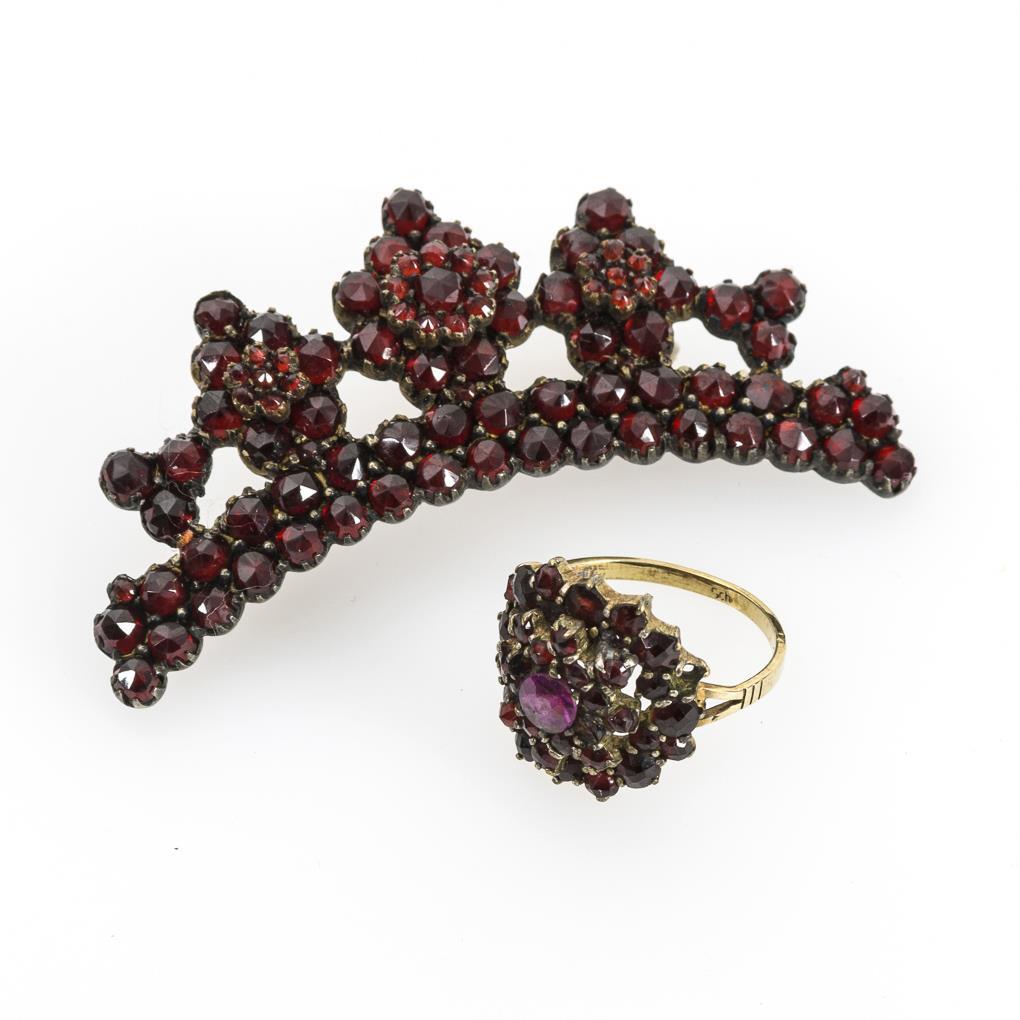 Diademförmige Brosche und Ring mit Granatbesatz. Schmale Schiene. Broschierung ergänzt.