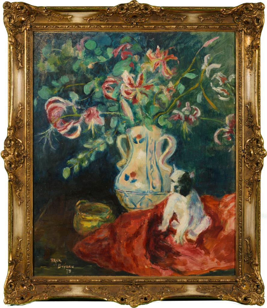 Porzellanfigur eines Hundes neben einem Blumenstrauß in einer Vase.