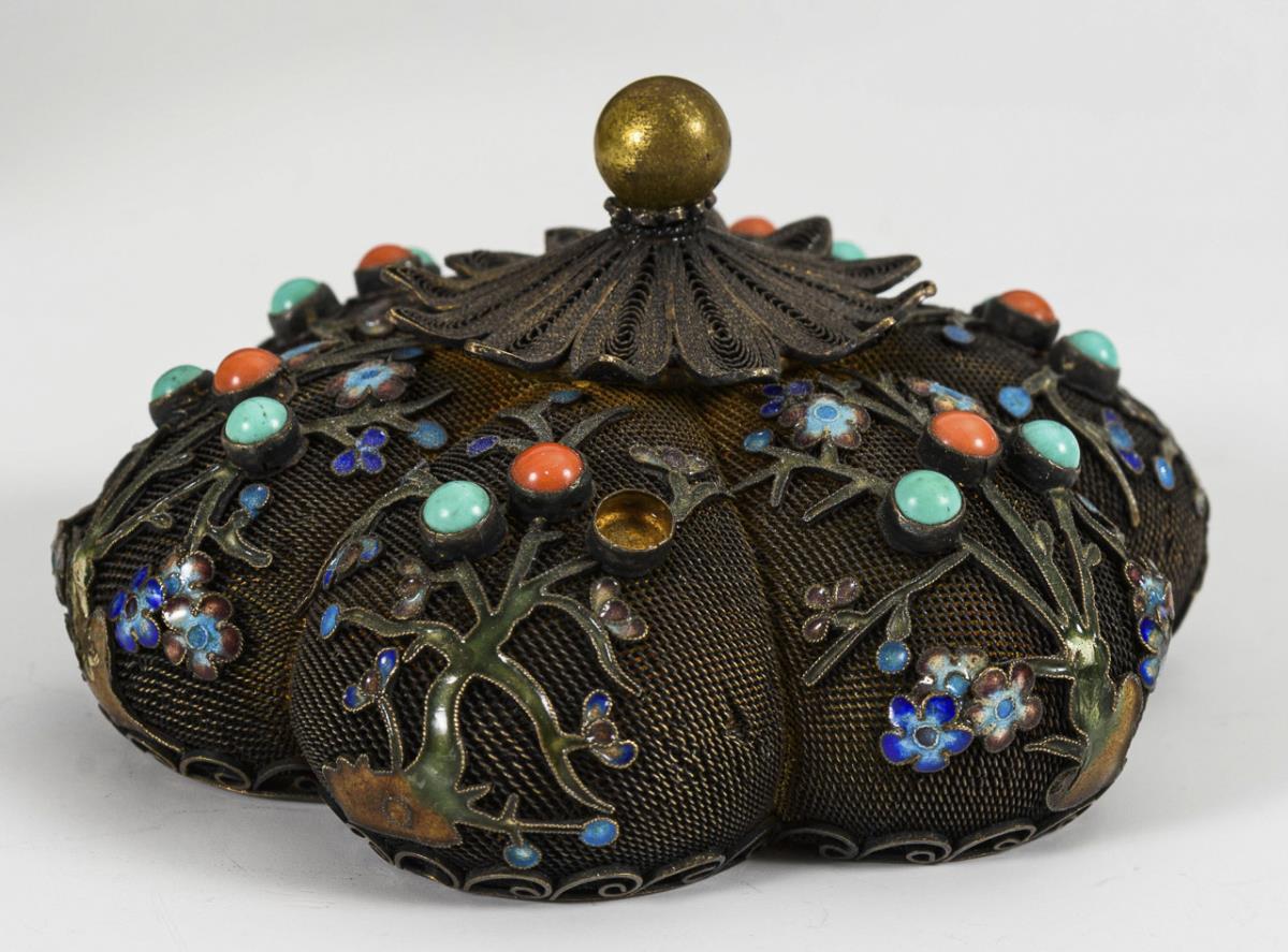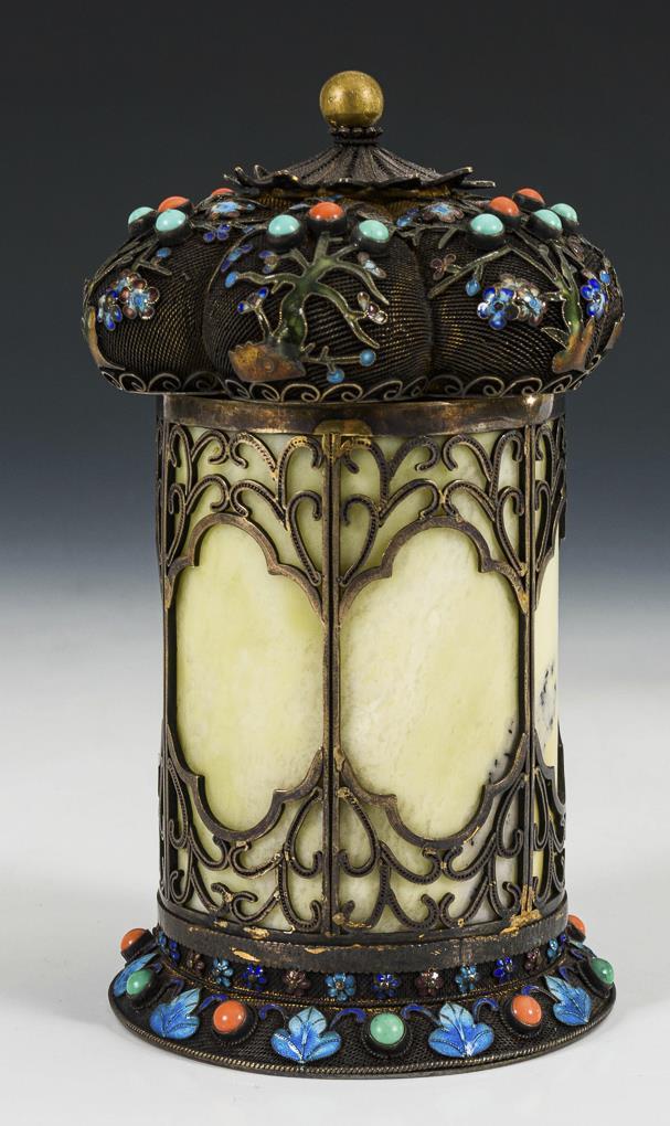 Zylindrischer Korpus aus weißlicher Jade, gefasst in filigraner Silbermontierung, mit Koralle, Email und Türkis verziert. Ein Türkis fehlt, leichte Gebrauchsspuren.